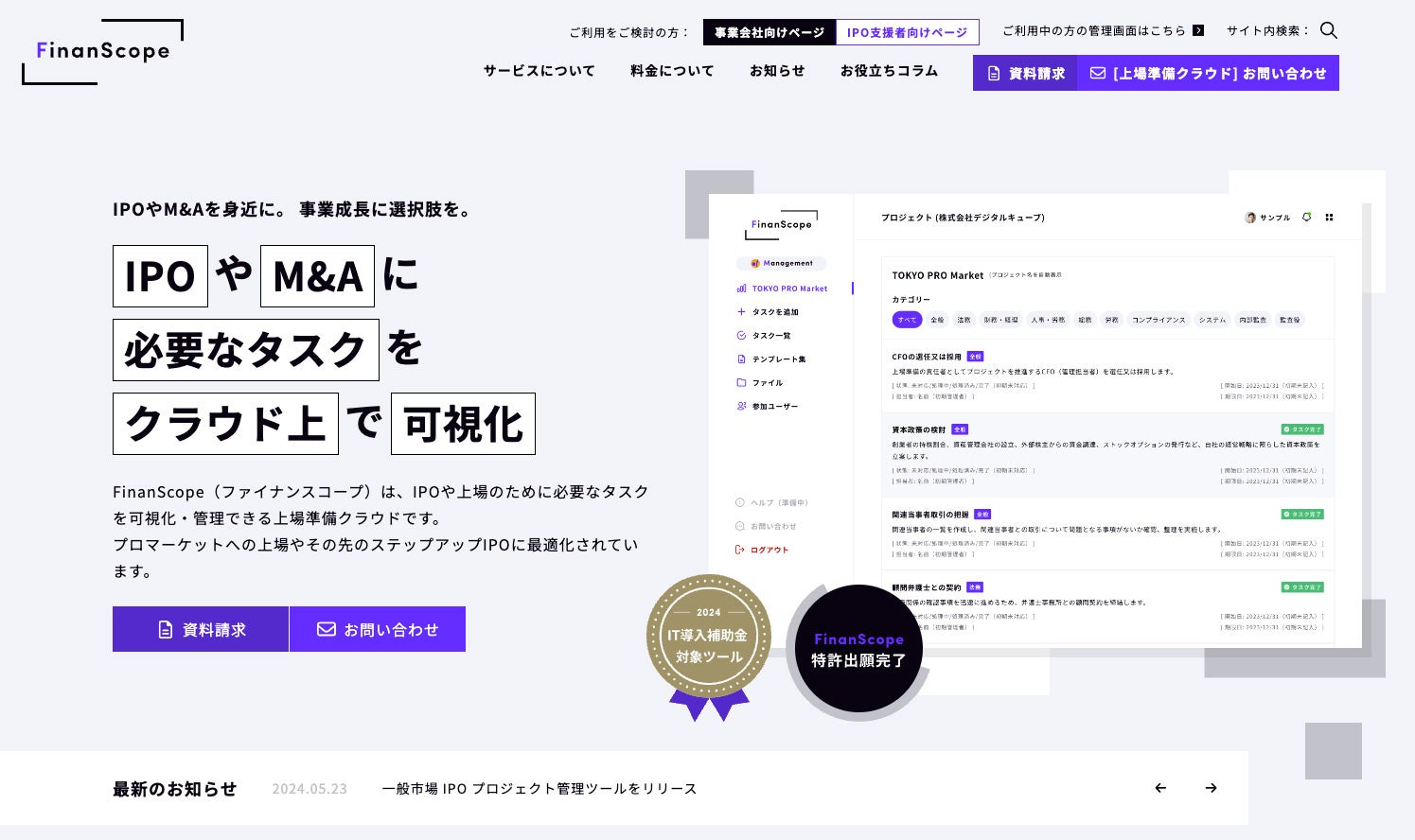 FinanScope は TPM 上場や IPO プロジェクトに必要なタスクを標準化して提供する 上場準備クラウドサービスです。いつ何をすればいいのか、どんなフォーマットでどんな書類を用意すればいいのかなど、プロジェクトに必要なタスクと進捗が一目でわかるようになり、IPO・上場プロジェクトを主体的に進めることができます。また、IPO・M&A の実務経験が豊富な公認会計士・税理士や各種士業専門家のネットワークを活かし、プロジェクトをサポート・推進します。