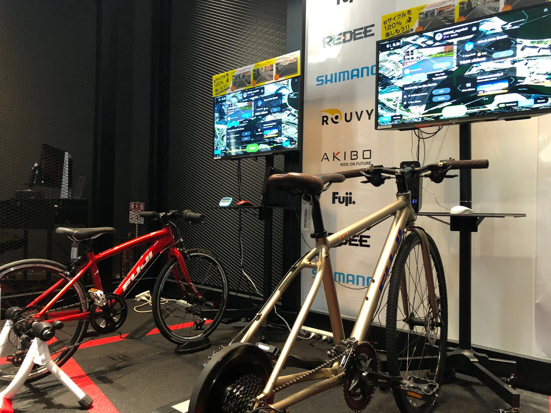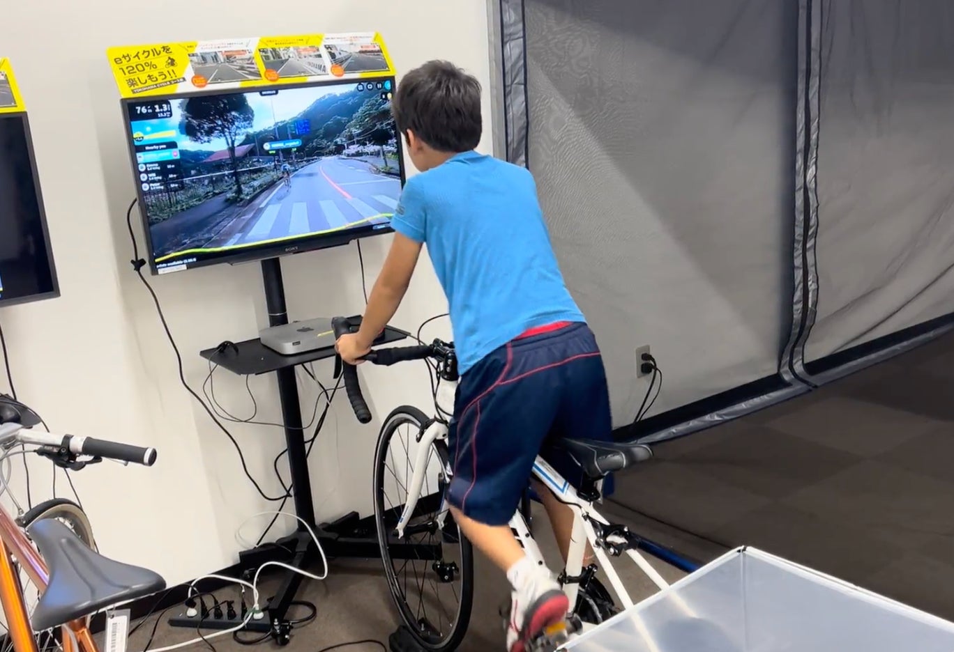 実際の自転車を漕ぐことでゲーム画面が連動して進むeサイクリングを体験していただきます。