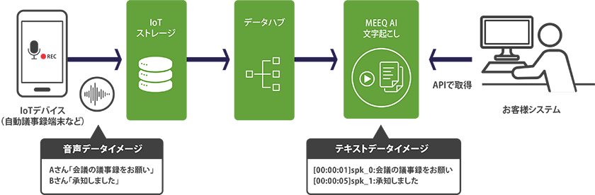 「MEEQ AI 文字起こし」は、IoTデバイスからMEEQ閉域ネットワークを経由して、IoTストレージに音声ファイルを送信することで、AI機能によりテキスト化されたデータを得られる機能※2です。お客様のIoTデバイス(録音機能とLTE等通信機能をもった)でMEEQ SIMを利用することで、セキュアな閉域網を経由したAI機能による「MEEQ AI文字起こし」が利用できます。テキスト化されたデータはAPI経由でも取得できますので、音声認識を応用したサービスを構築することが可能です。