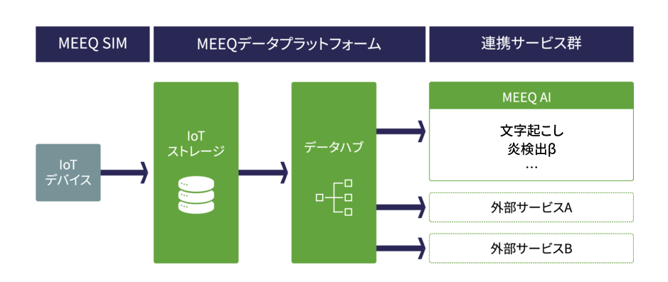 「MEEQ AI 文字起こし」を利用することで、MEEQ SIMを通じてIoTストレージにアップロードした音声データを、テキスト化されたデータとして取得できます。これにより、AI処理とセキュアな通信を組み合わせた文字起こしのためのシステム構築が容易に実現でき、IoTサービス事業者が独自の音声認識サービスを提供することや、企業や行政などで音声や通話を使用した業務のDX促進に活用できます。