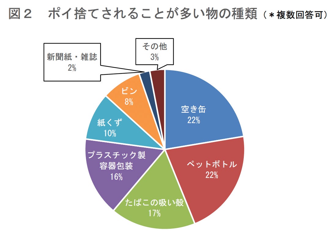 環境省の令和5年度「ポイ捨て」に関する調査報告書によると、ポイ捨ての種類で一番多いのは空き缶・ペットボトル(それぞれ22%)、次いでたばこの吸い殻(17%)とされています。