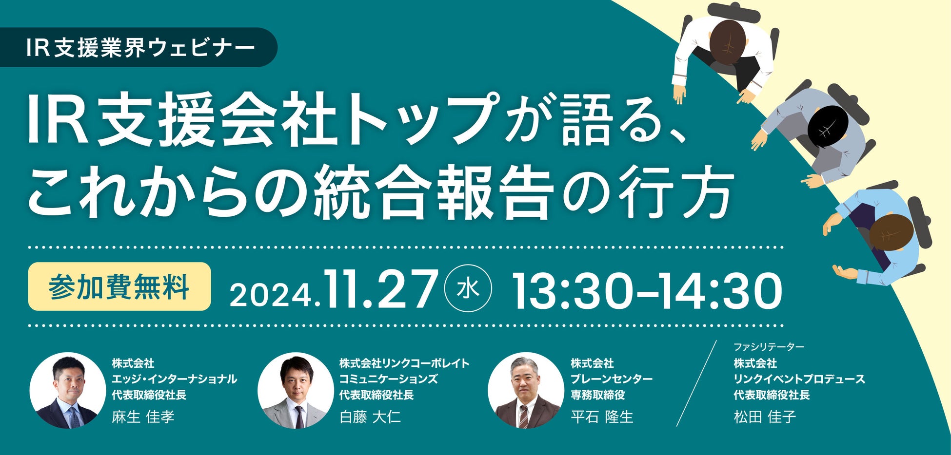 株式会社リンクコーポレイトコミュニケーションズ(本社:東京都中央区 代表:白藤大仁)は、株式会社ブレーンセンター、株式会社エッジ・インターナショナルとともに、「これからの統合報告の行方」をテーマに無料WEBセミナーを共催します。