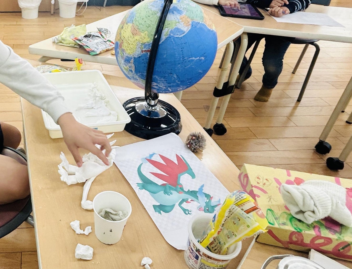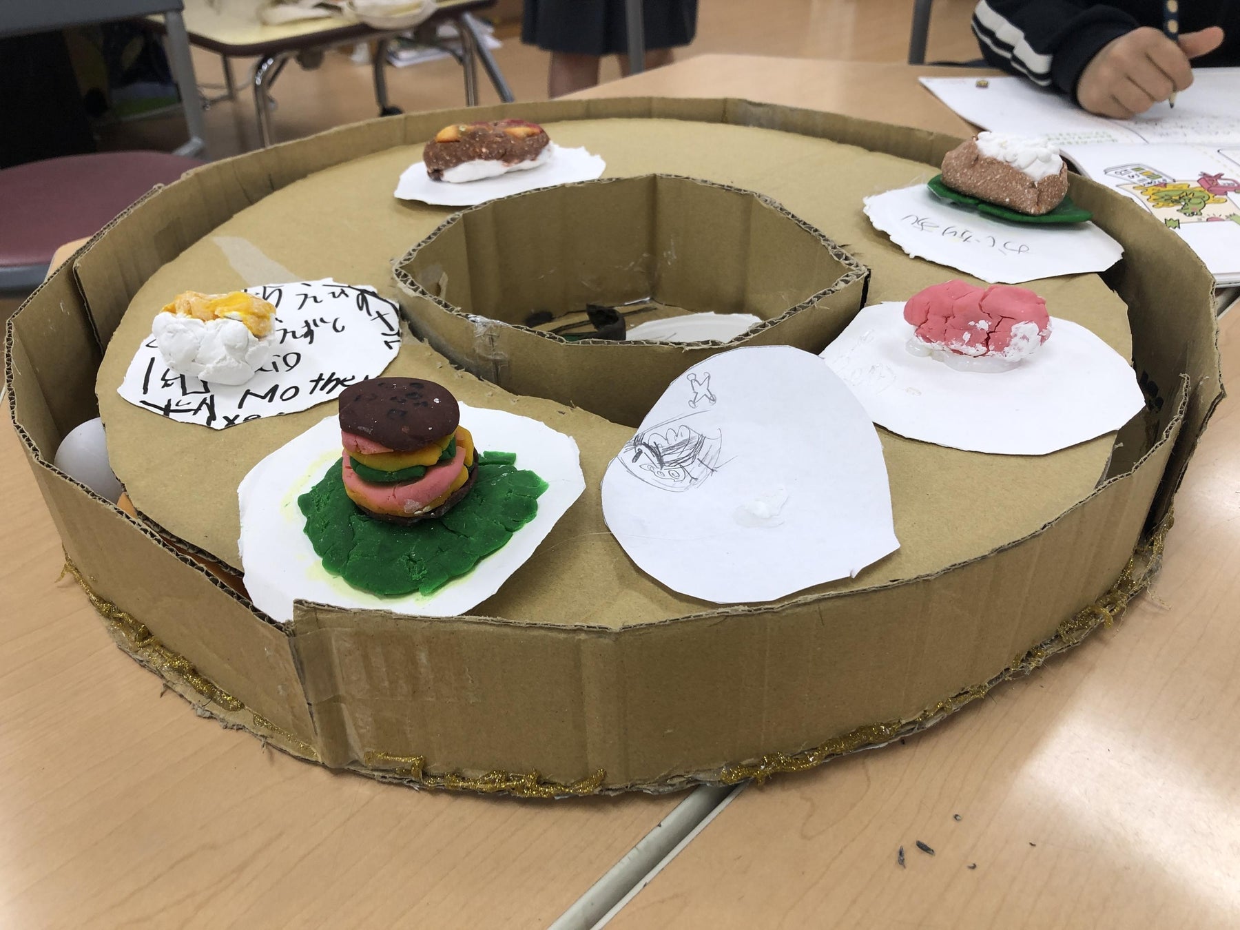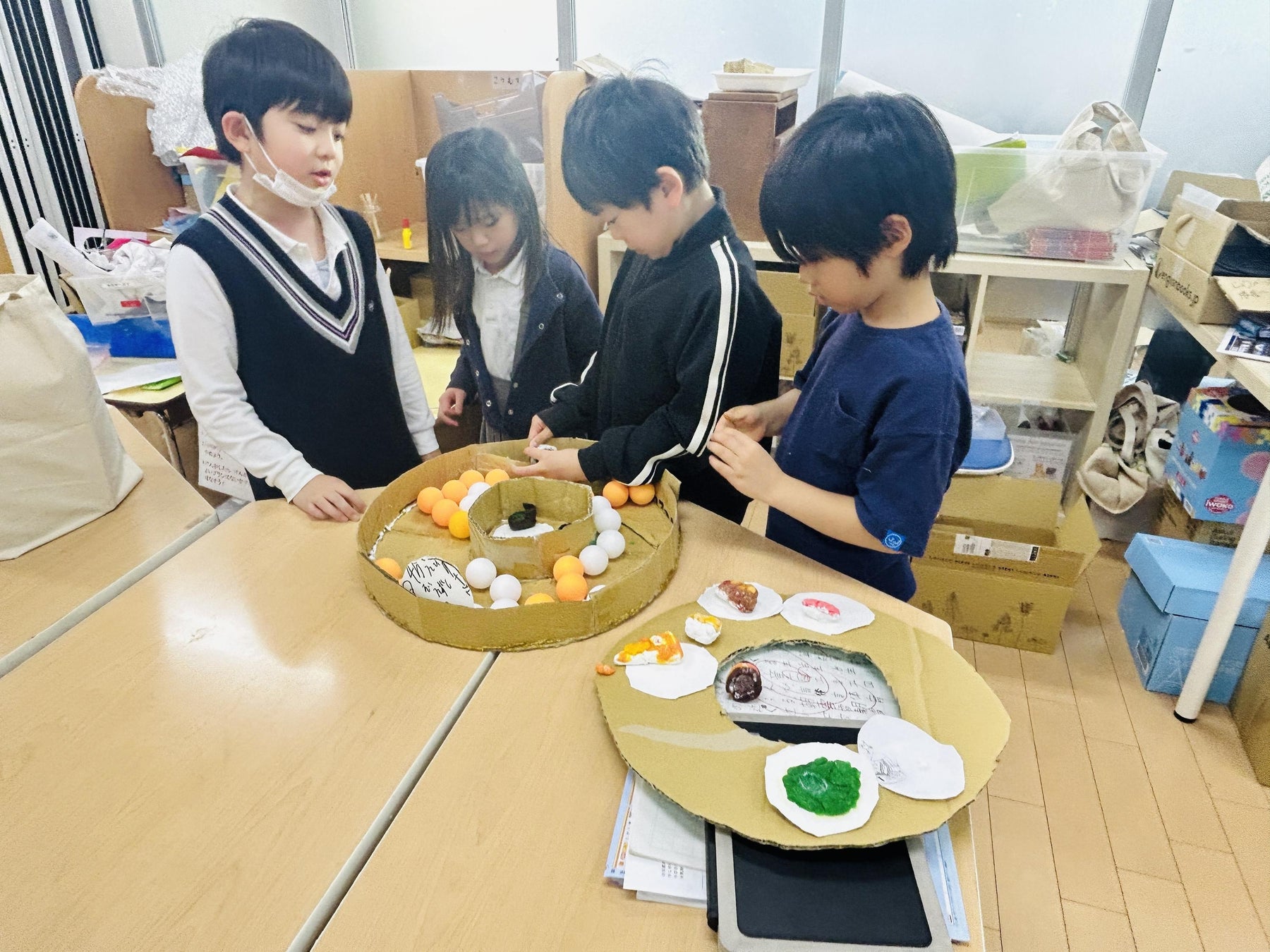 「回転寿司を作ってみたい!」という発想から生まれたチームは、ダンボールを使って立体的で本格的なレーンとお寿司を制作しました。他にも、カラフルなお菓子を実際に作るチーム、釣りゲームのようなオリジナルボードゲームを開発するチームなどが活気に溢れた活動を行いました。