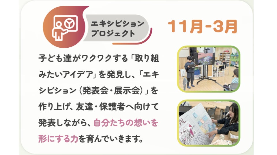 お子さんたちが自ら発見した「取り組みたいアイデア」を形にし、保護者や友だちに向けて発表するエキシビションを実施しました。