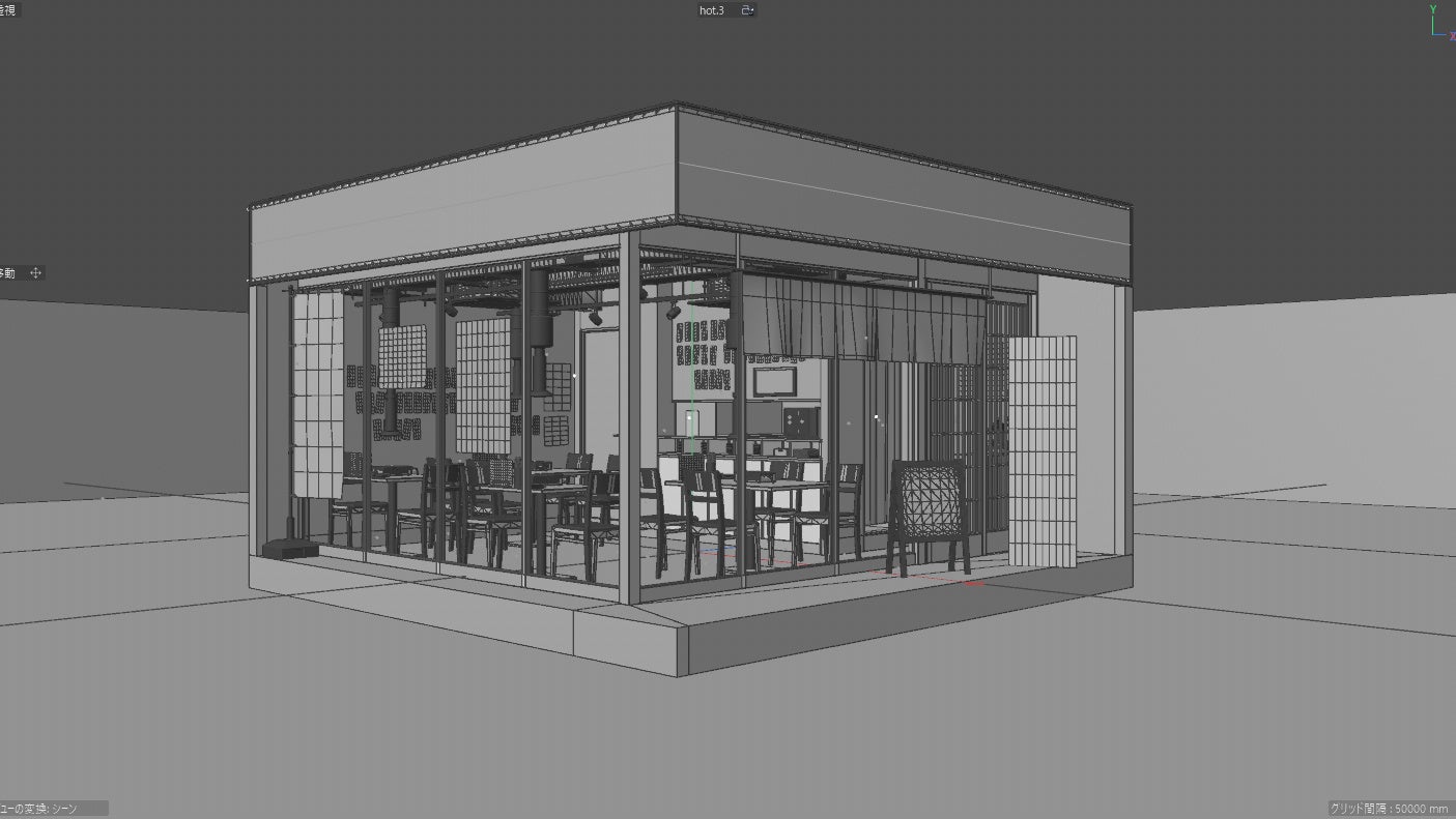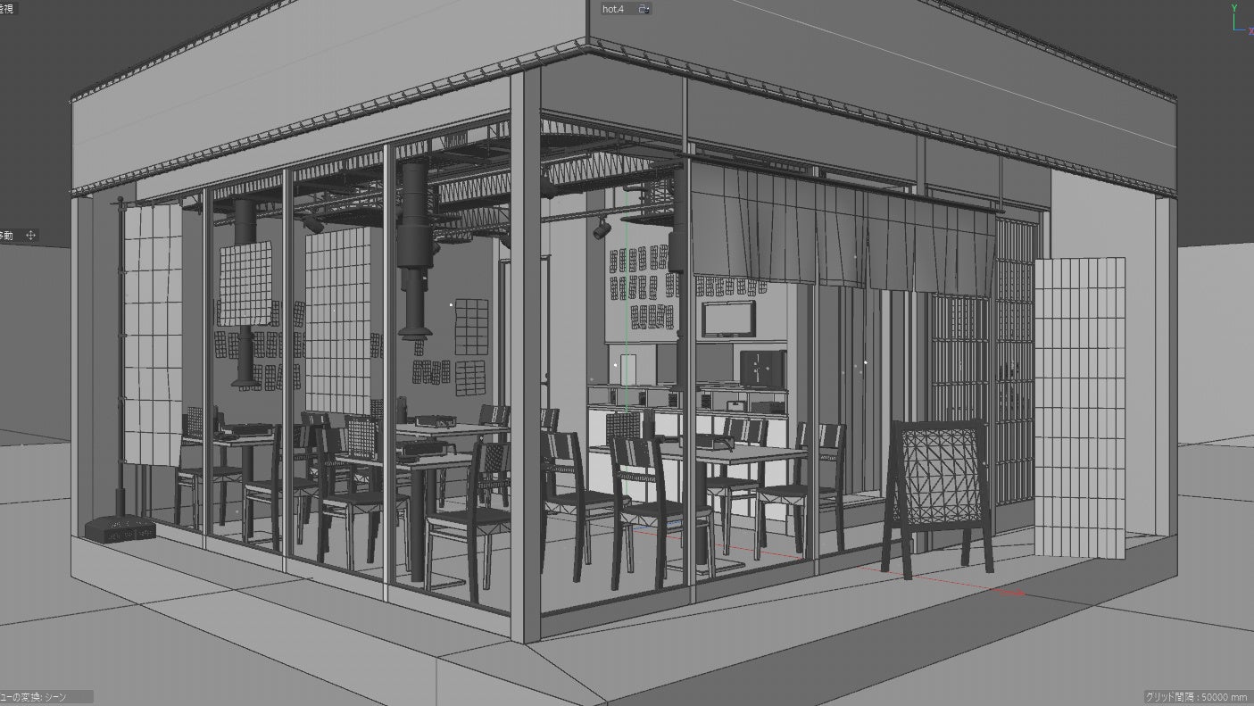一定のホットスポット(視点)から【BOX】を撮影し、撮影した写真に対して3D上でカメラトラッキングを施しております。写真情報から寸法や奥行きなどを合わせることが可能なため、【BOX】のボリューム内に実寸法通りの飲食店を再現しております。投影される2面のそれぞれの1面では画像が歪んで見えるため分かりづらいものの、ある一定の視点から見ると立体的な飲食店が現れるようなビジュアル上の仕掛けを施しております。