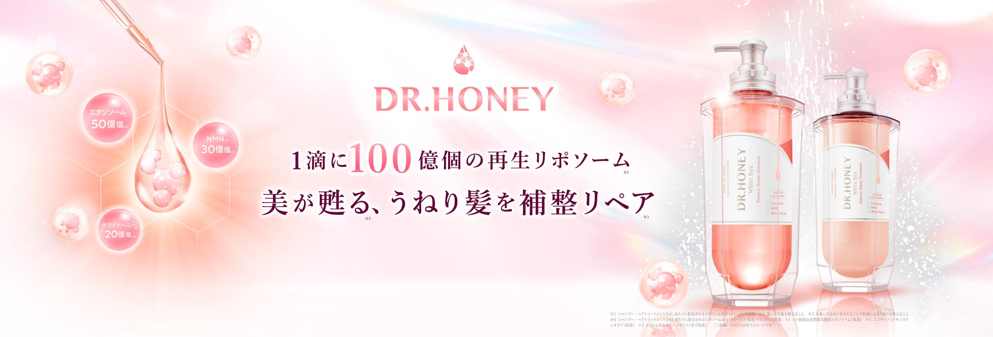 ハチミツ再生科学※19シャンプー『DR.HONEY(DRハニー)』 は、今話題の美容液成分「エクソソーム*1 」や「NMN *2 」、「リポソーム※20」に着目し、ハチミツ再生科学※19とリポソームテクノロジー※8を組み合わせたヘアケアブランドです。