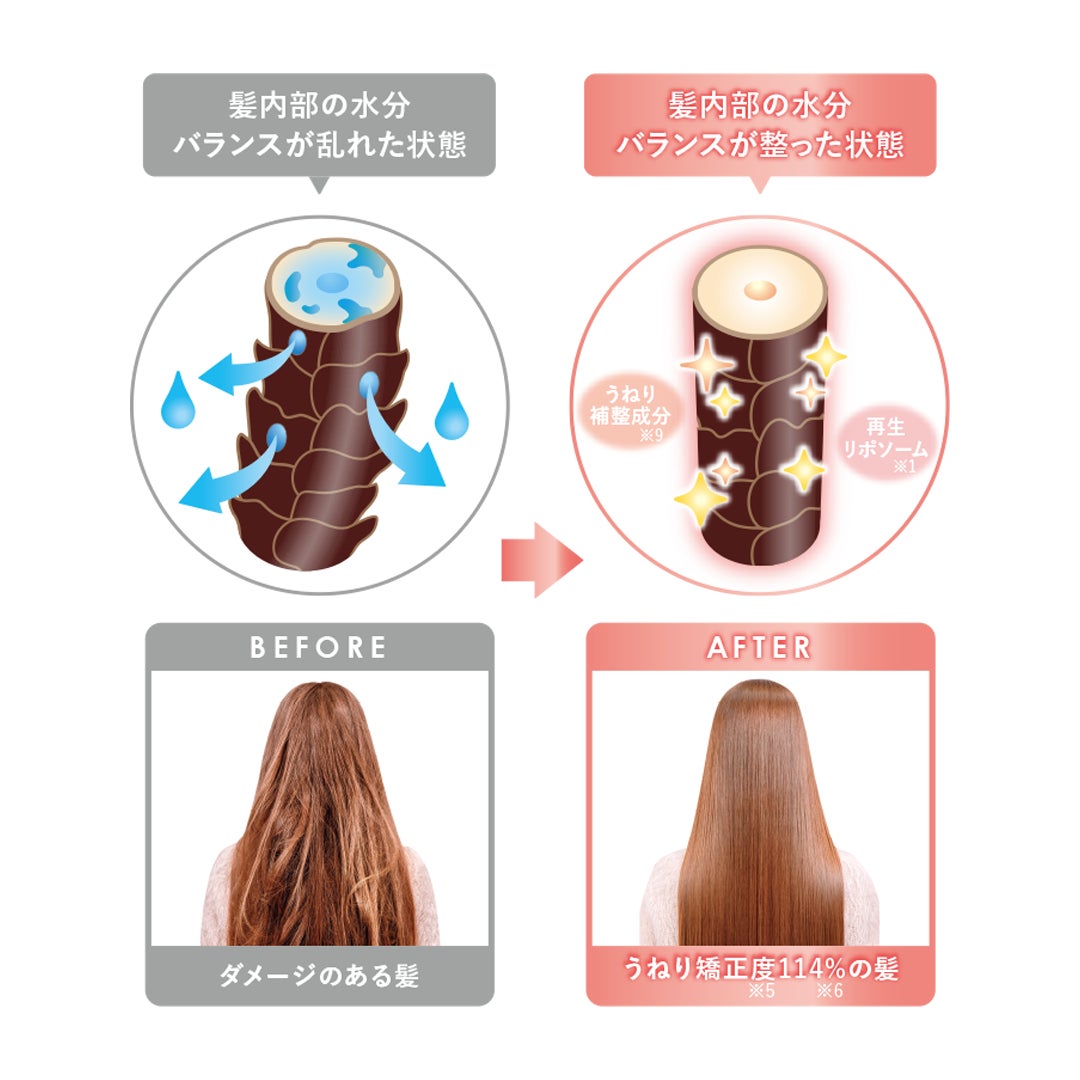 再生リポソーム※1が髪内部に浸透し、うねり矯正度※5 114% ※6の髪へ導きます。