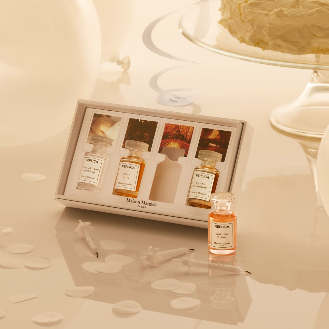 ・「レプリカ ミニチュア セット」は、ベストセラーの「レイジーサンデー モーニング」の香りに加え、「ジャズ クラブ」、「バイ ザ ファイヤープレイス」、「オータム バイブス」の香りを合わせた4種のオードトワレ(7mL)のセット。