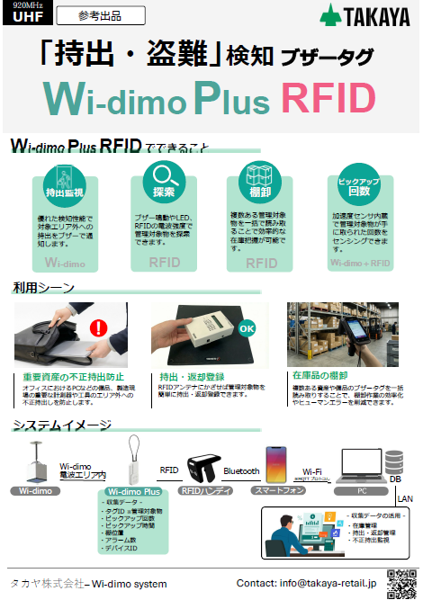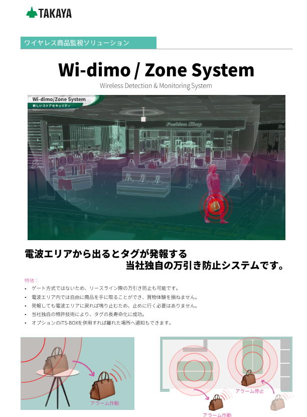 Wi-dimo は、商品や備品をエリア単位で管理できる持ち出し防止システムです。