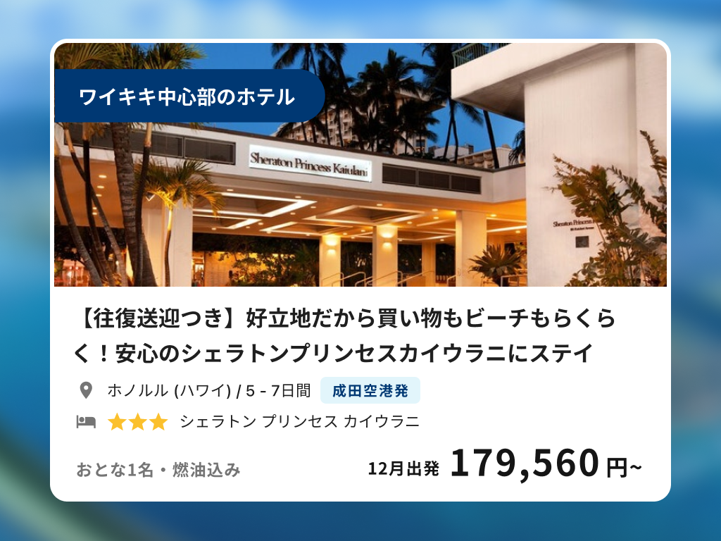 【往復送迎つき】好立地でらくらく!安心のシェラトンプリンセスカイウラニにステイ
