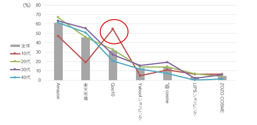 全国15歳~49歳の女性1,000名を対象に、ECモールでのアイライナー購入先を調査した結果、6割以上が「Amazon」と回答。一方で10代は「Qoo10」が最多回答となった。各ECモール毎の「取扱品」「価格帯」「話題性」などの違いによりユーザー年代層に傾向差がでることが推察される結果となりました。