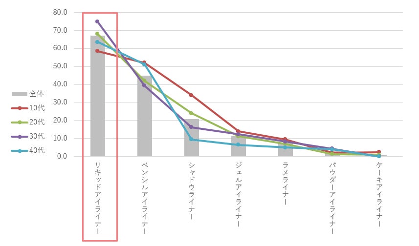 全国15歳~49歳女性1,000名を対象に、日頃使用しているアイライナーを調査した結果、6割以上が「リキッドアイライナー」と回答。どの年代においても、使用率の高いアイライナーがリキッドタイプであることが判明しました。