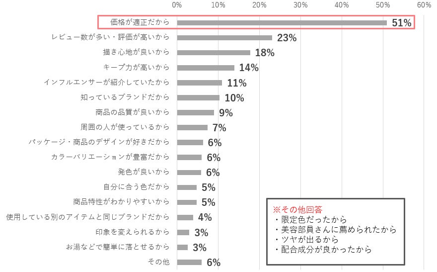 全国15歳~49歳の女性1,000名を対象に、アイライナーを購入した理由を調査した結果、5割以上の方が「価格が適正だから」と回答。次いで「レビュー評価」「描き心地」と回答。第三者からの商品評価とアイライナーの使用感を踏まえた上で、ご自身の価格と価値が合うことが購入動機となることが推察される結果となりました。