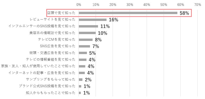全国15歳~49歳の女性1,000名を対象に、アイライナーの新商品などを知ったきっかけを調査した結果、5割以上の方が「店頭」と回答。次いで「レビューサイト」「インフルエンサーによるSNS投稿」と回答。情報入手先は様々ありますが、商品を実際に確認できる「店頭」が最も印象に残っていることが推察される結果となりました。