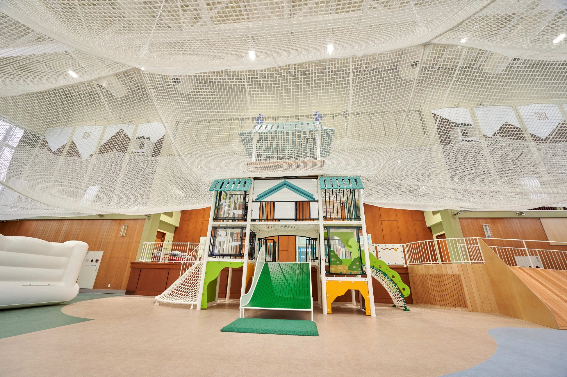 日本海側の気候として特徴的な、雨や雪の日が多い福井県は日本一幸福な子育て県「ふく育県」の実現の一環として、全天候型遊び場を整備するため全17市町に最大1億円を補助する制度を設けました。その一つである、「おおの天空パーク OSORA」のあそび空間をジャクエツがデザインいたしました。雄大な自然に囲まれ、城下町の歴史に風情を感じる大野にふさわしい空間をテーマにあそび場を構想。もともと、体育館であったことを活かし、室内でも子どもたちがのびのびと走り回れる空間を実現しました。大野市のシンボルである大野城をモチーフにしたタワー遊具は高さ6mと迫力満点の遊具となっており、そのタワーを囲うように広がるネットは大野城にかかる雲海をイメージ。県内最大規模のネット遊具となっています。全12種類の遊具が設置され、城・街・雲・山・水・雪と6つのエリアを配置し、乳児期→幼児期→児童期の各年齢に応じて難易度を変化させ、子どもたち一人ひとりの個性や成長に合わせたあそび空間を創り出しました。大野の魅力に触れながら様々な運動スキルを習得できるような設計になっています。