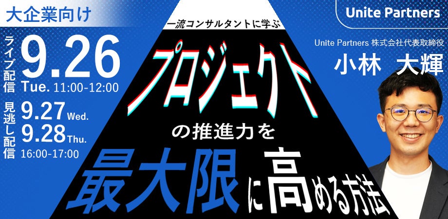企業の変革パートナーを目指すブティック型コンサルティングファームのUnite Partners株式会社(本社:東京都、代表取締役:小林大輝)は、2023年9月26日に、「大一流コンサルタントに学ぶ、プロジェクトの推進力を最大限に高める方法」と題してセミナーを開催します。