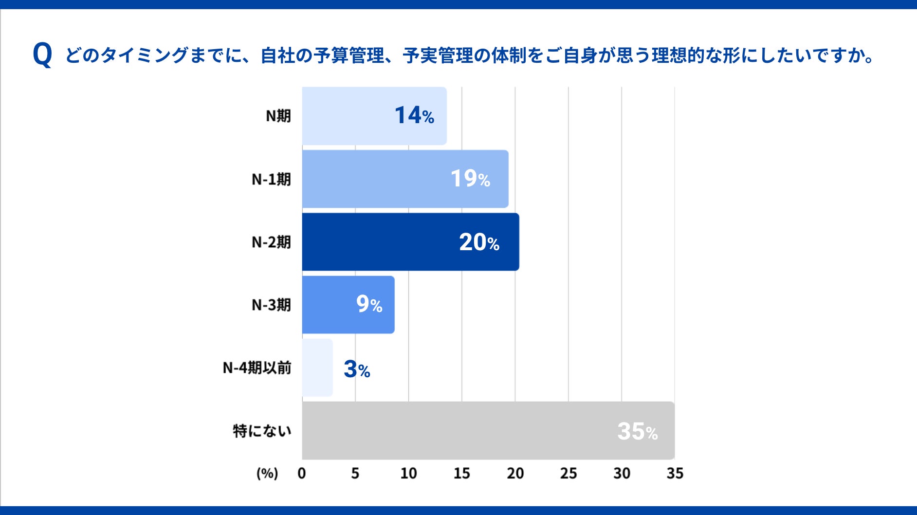 「どのタイミングまでに、自社の予算管理、予実管理の体制をご自身が思う理想的な形にしたいですか。」(n=103)と質問したところ、「N期」〜「N-2期」が約53%、「特にない」が約35%という回答となりました。