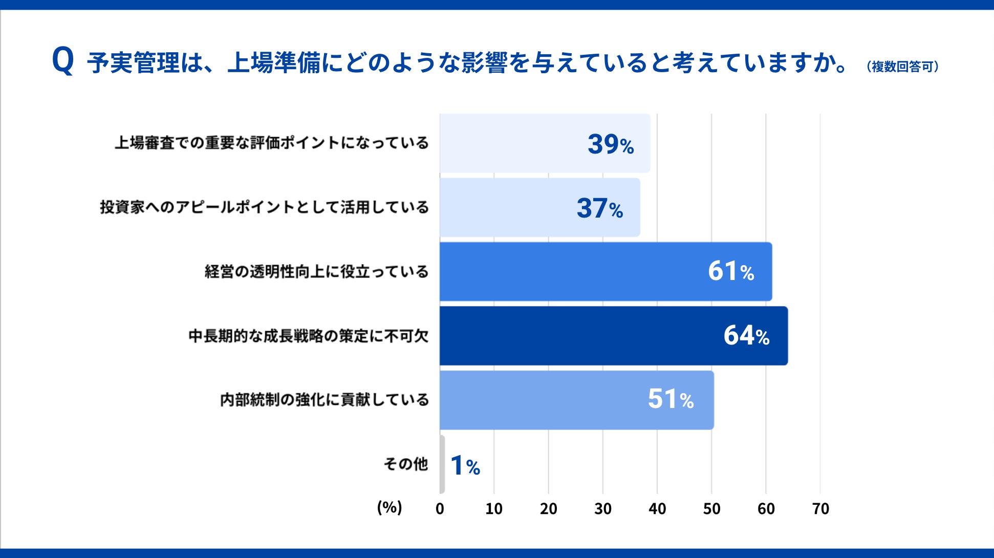 「予実管理は、上場準備にどのような影響を与えていると考えていますか。」(n=103)と質問したところ、もっとも多かった回答が「中長期的な成長戦略の策定に不可欠である」、次に「経営の透明性向上に役立っている」となりました。