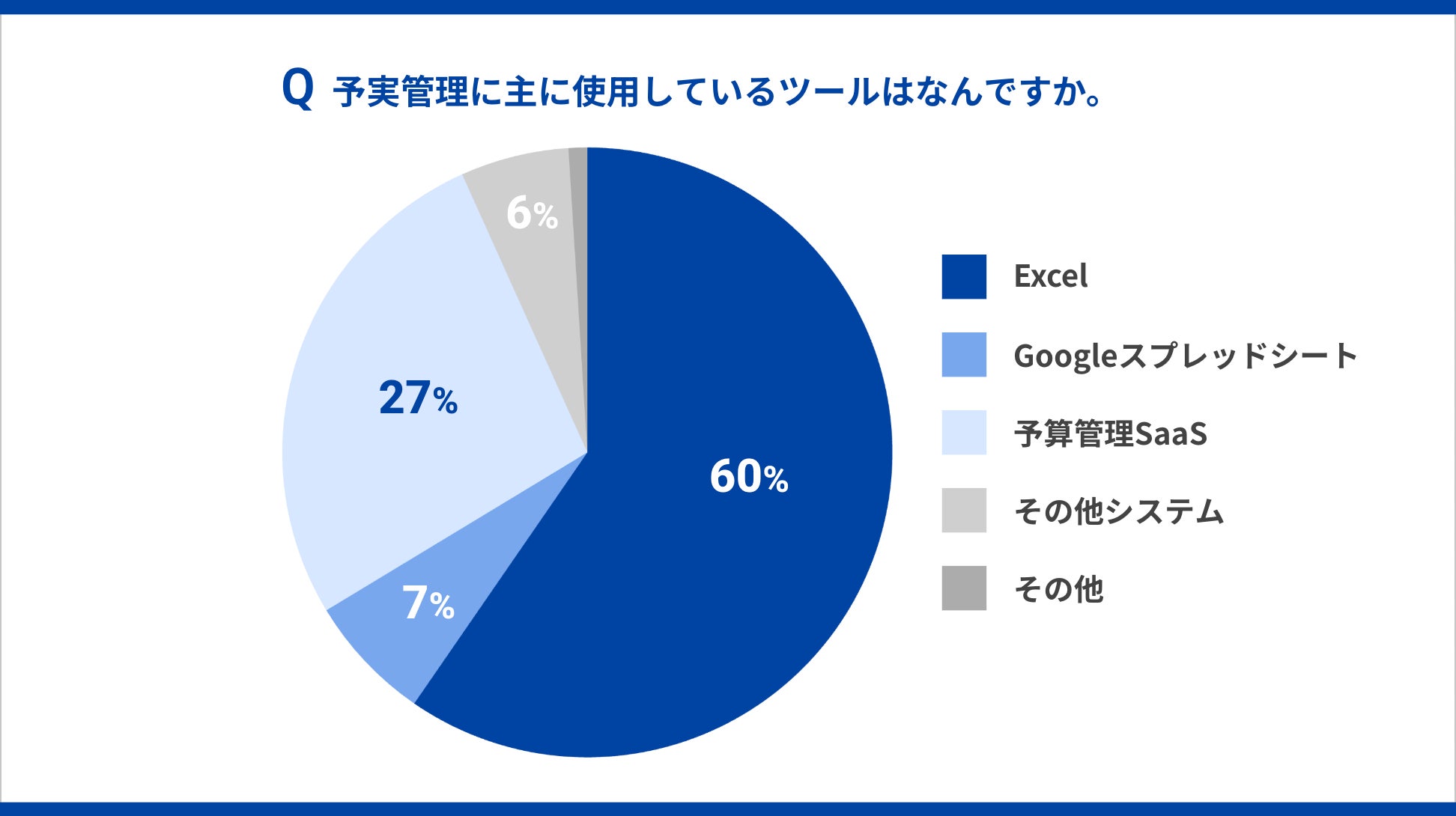 「予実管理に主に使用しているツールはなんですか。」(n=103)と質問したところ、ExcelやGoogleスプレッドシートなどの表計算ソフトを利用している企業が回答者の67%と半数以上でした。一方、システム利用者は33%に留まっており、多くの会社では、エクセル以外の選択肢を持てていない可能性がうかがえます。