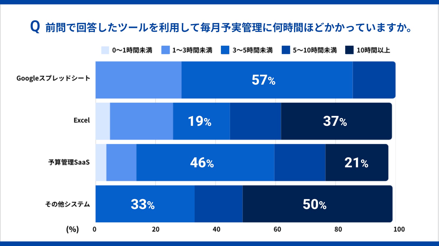 ツールを利用して予実管理を行っていると回答した企業に対し、「毎月予実管理に何時間ほどかかっていますか。」(n=103)と質問したところ、Excelを利用するという回答のうち、月10時間以上という回答が約37%を占めていました。一方で予算管理SaaSを活用している回答者は、3~5時間未満の回答が約46%と、最も多い結果となりました。