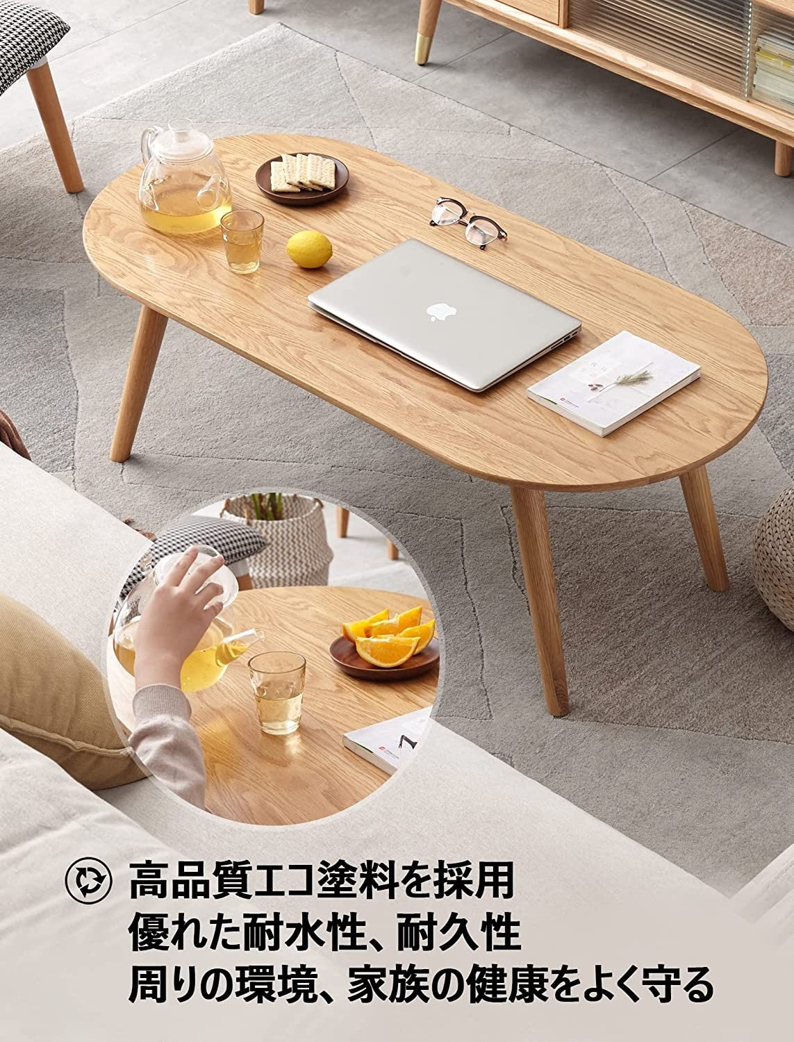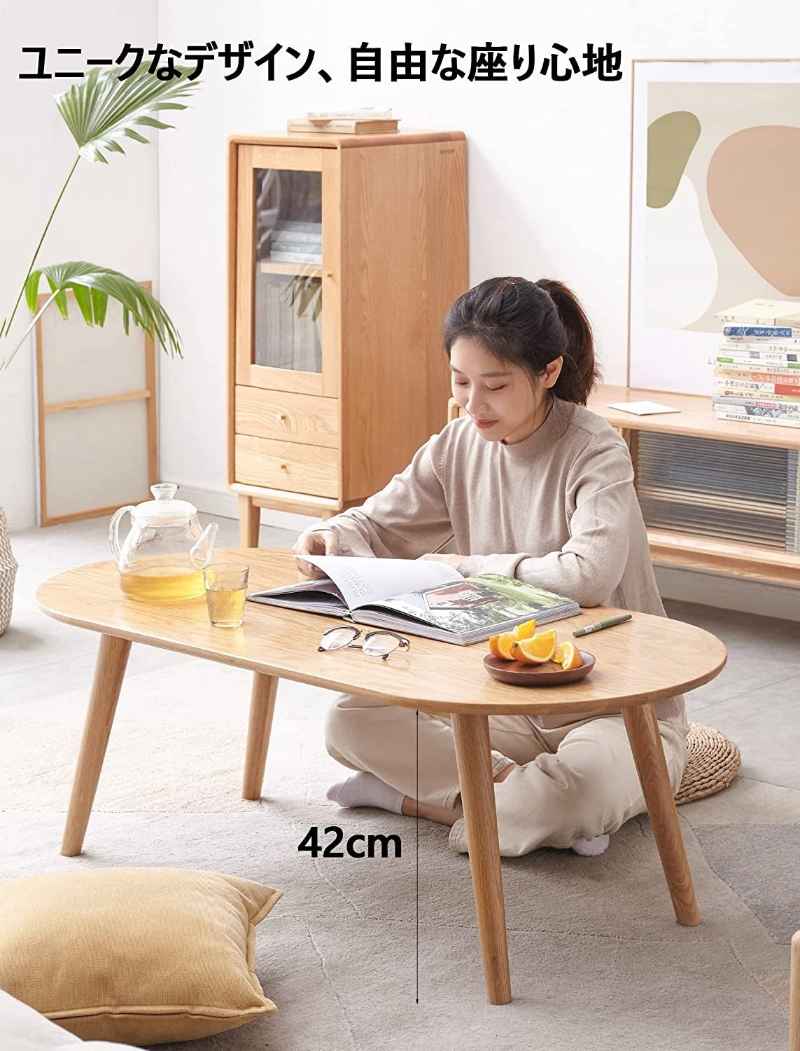 木製のローテーブルは独特な設計を採用して、リビングや寝室、書斎などで場所を取らず、ちょうどいいサイズです。ローテーブルの高さは42cmで、広いスペースがあり、あぐらをかいて本を読んでも自由な座り心地。それに、雑誌やブランケットなどの収納にも活用できます。サイズは約幅120cmx奥行65cmx高さ42cm で、仕事をしている時、ローテーブルの上にコップやノートなどが置いてあっても、窮屈さを感じないです。