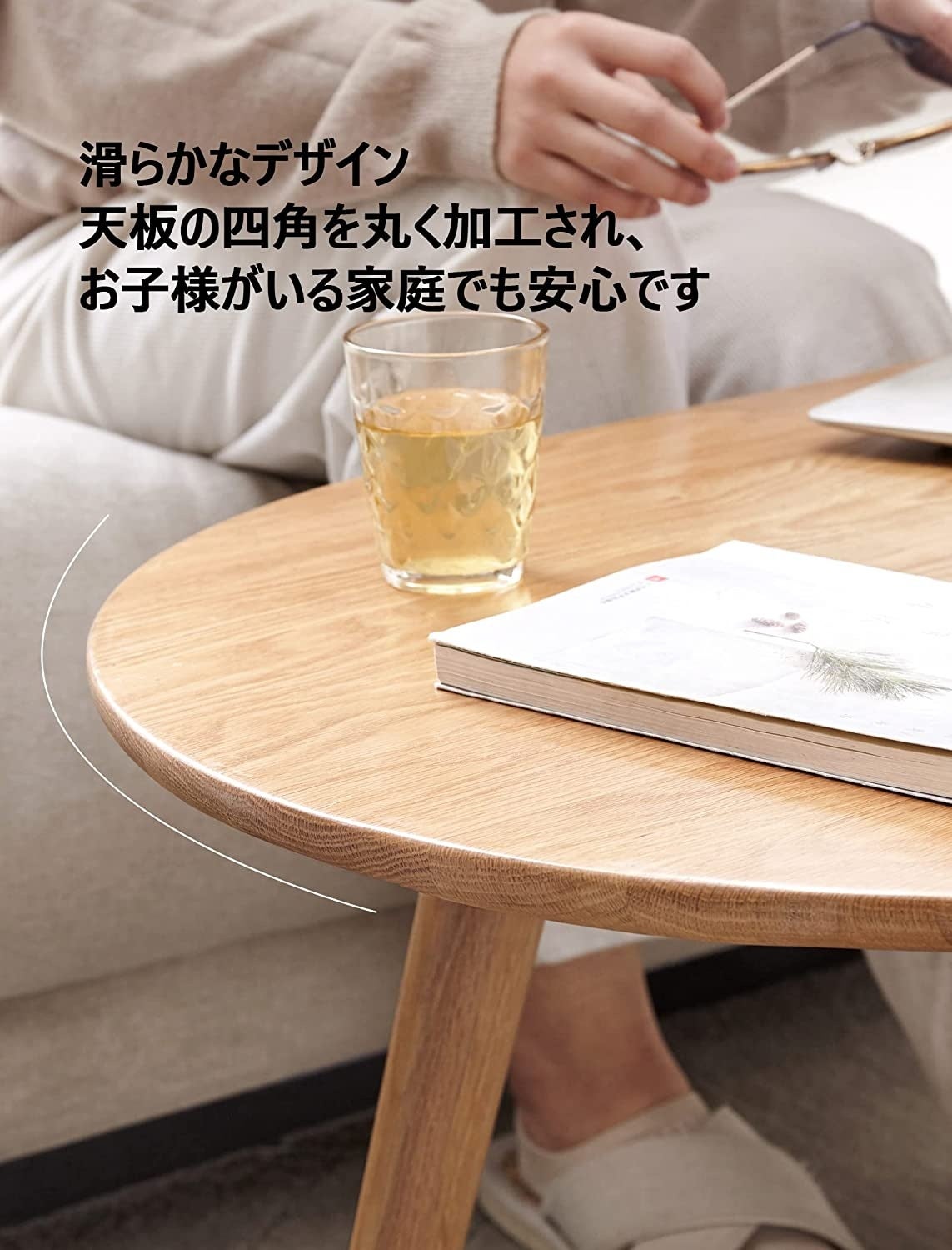 このロールテーブルは天板の四角を丸く加工され、デスクトップも鋭いエッジのない滑らかで繊細な仕上げにし、 全体的に楕円形のデザインになっています。子供がいる家でもご安心して利用いただけます。天板は厚さのある一枚板でできていて、普通の突板テーブルより頑丈で重厚感があり、耐久性に優れています。しっかりとした四つの斜め脚、全方向の安定性を確保します。それに、 傷つき防止フェルト付きなので、床などに傷をつける心配もありません。