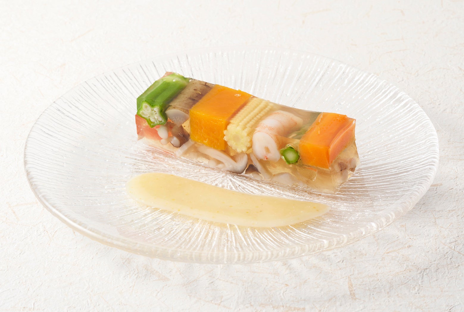 まるで宝石のような見た目が食欲をそそる一品。黄身酢ソースと共にお召し上がりください。