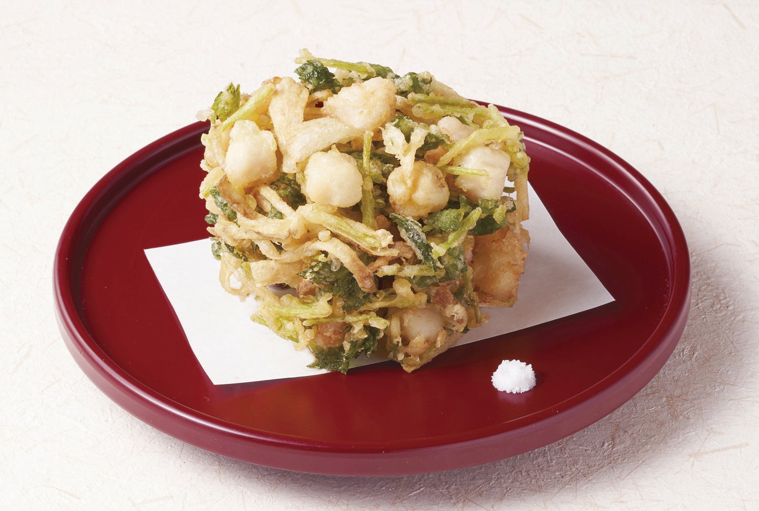 旨みのある小柱と海老に牛蒡を加え、かき揚げにしました。サクサクの食感をお楽しみください。