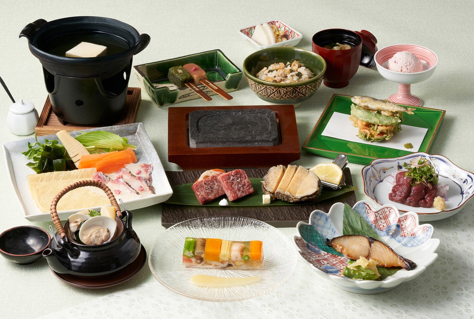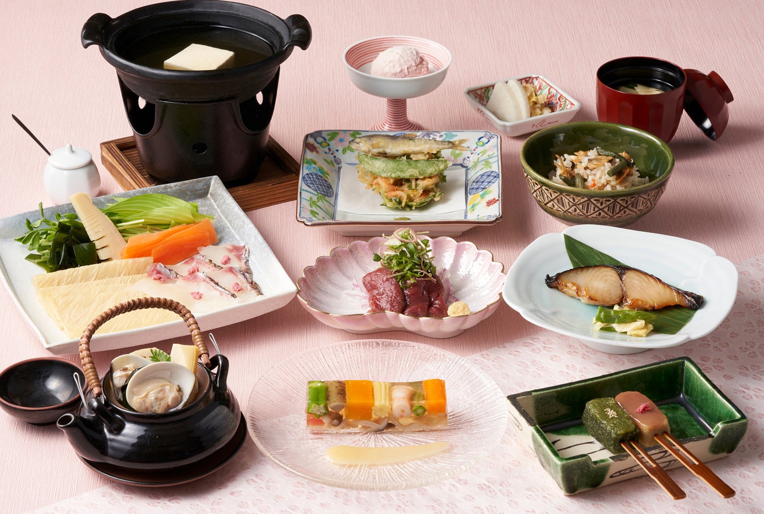 彩り野菜のゼリー寄せ・春の生麩田楽(蕗の薹味噌・桜味噌)・蛤の土瓶蒸し・桜肉のお造り・桜鯛と湯葉のしゃぶしゃぶ・稚鮎の天婦羅と桜海老のかき揚げ・鰆の西京焼き・湯葉吸物・あさりと山菜の炊き込み御飯・香の物・苺豆乳アイス