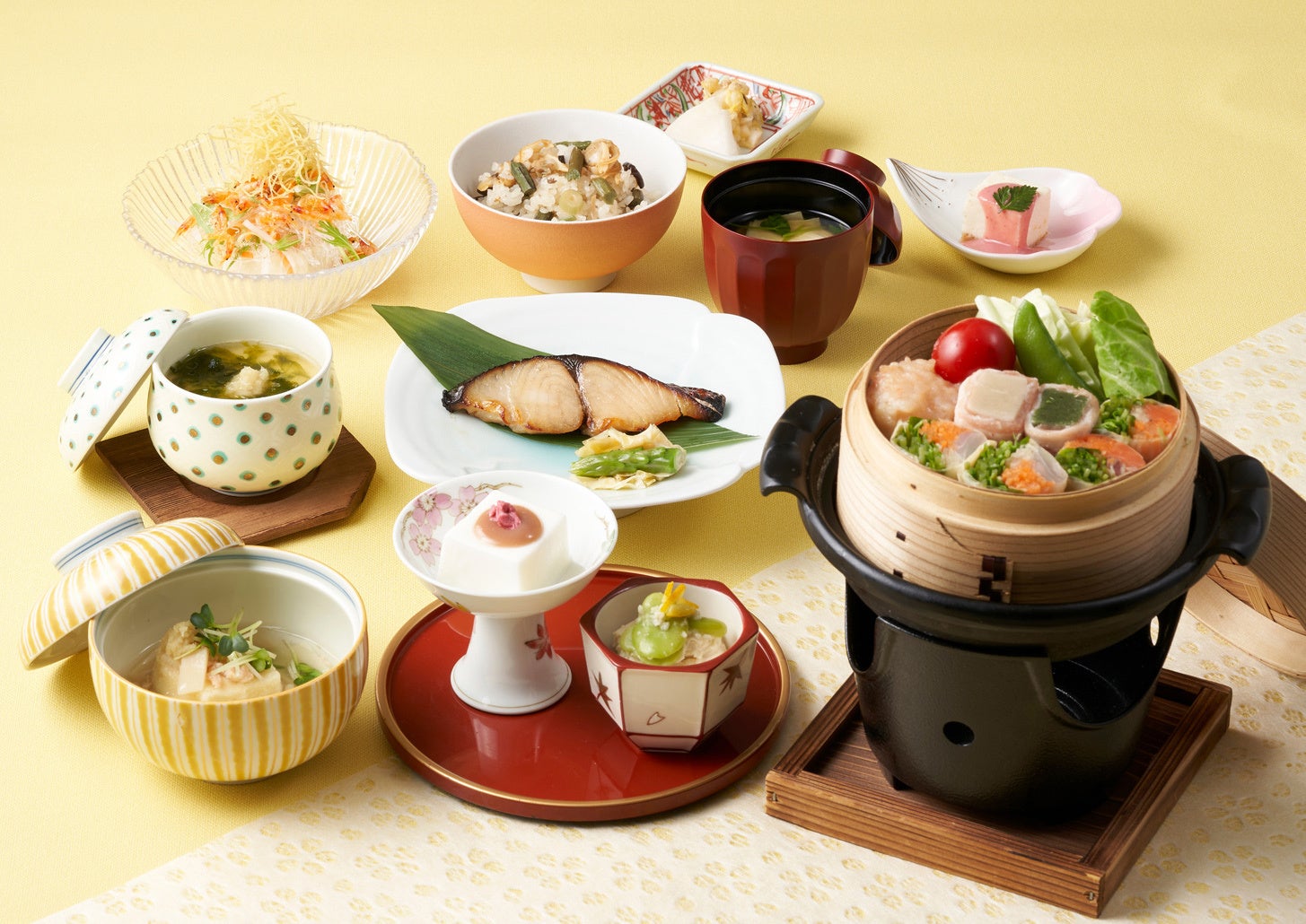 嶺岡豆腐 桜味噌・湯葉煮と空豆の塩麴和え・茶碗蒸し あおさ海苔あん・桜海老の豆腐サラダ・豆乳もち 大豆ミートと筍のあん掛け・彩り野菜の湯葉巻きとえびづつみのセイロ蒸し・鰆の西京焼き・湯葉吸物・あさりと山菜の炊き込み御飯・香の物・豆腐レアチーズケーキ