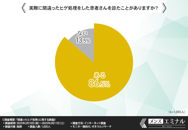 「実際に間違ったヒゲ処理をした患者さんを診たことがありますか?」と質問したところ、8割以上の方が『ある(86.5%)』と回答しました。