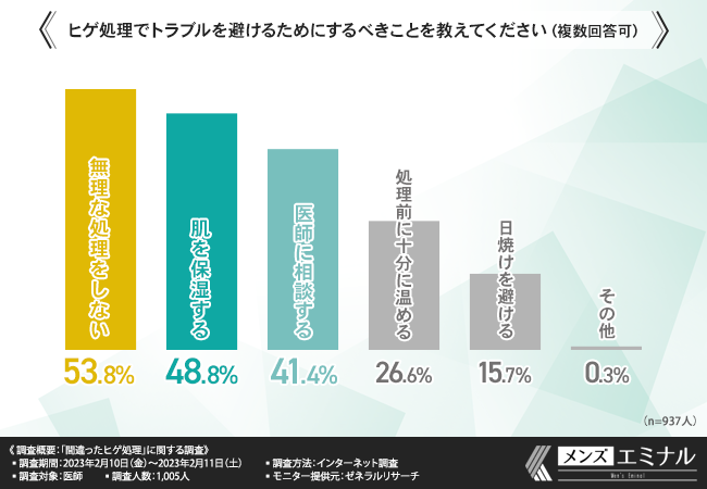 そこで、「ヒゲ処理でトラブルを避けるためにするべきことを教えてください(複数回答可)」と質問したところ、『無理な処理をしない(53.8%)』と回答した方が最も多く、次いで『肌を保湿する(48.8%)』『医師に相談する(41.4%)』『処理前に十分に温める(26.6%)』『日焼けを避ける(15.7%)』と続きました。