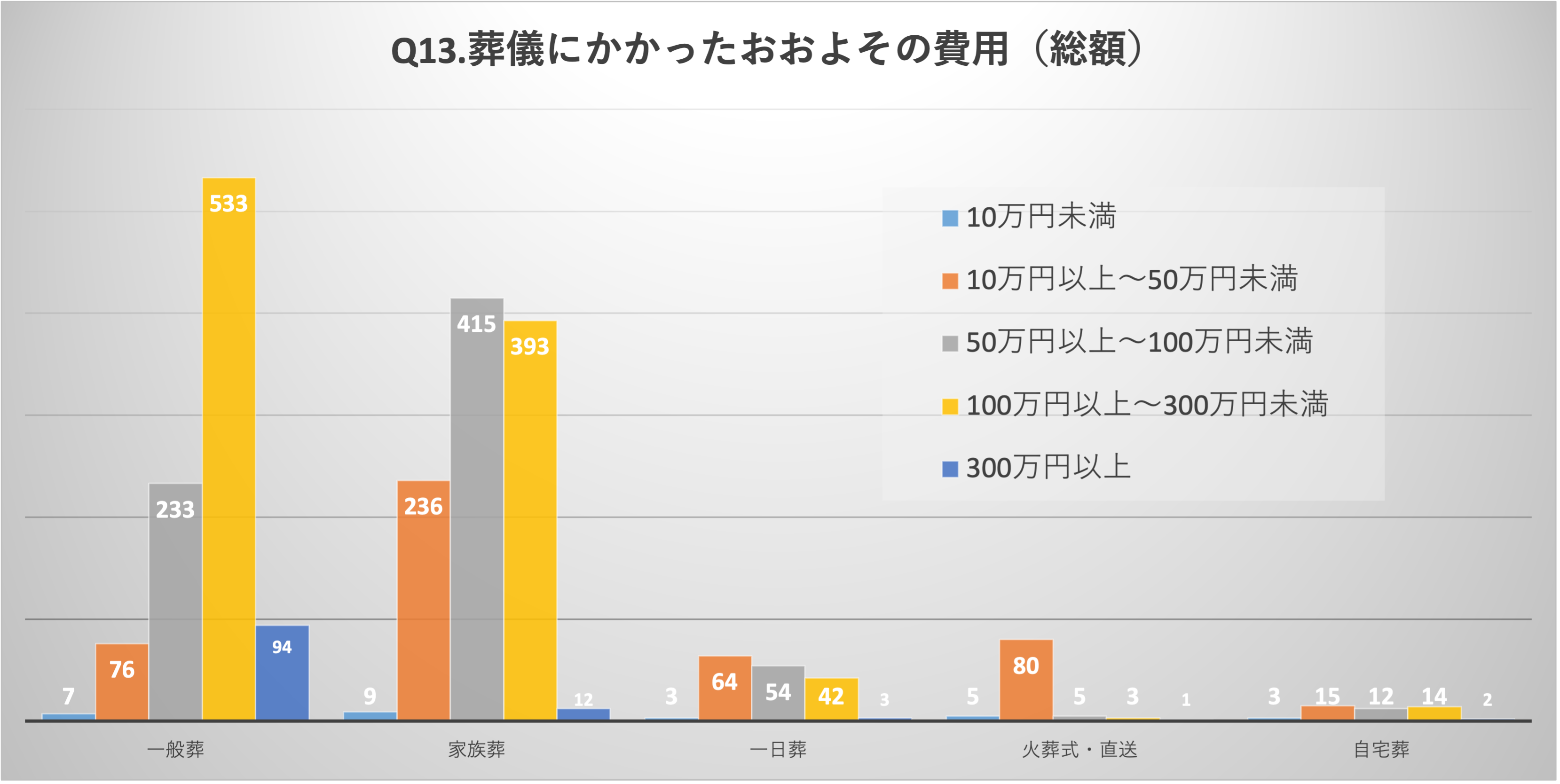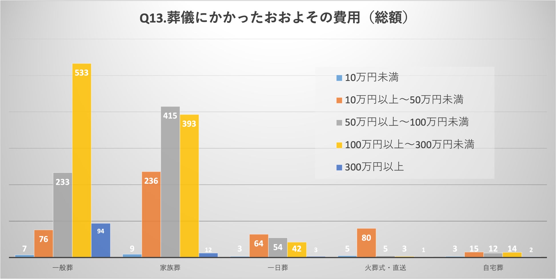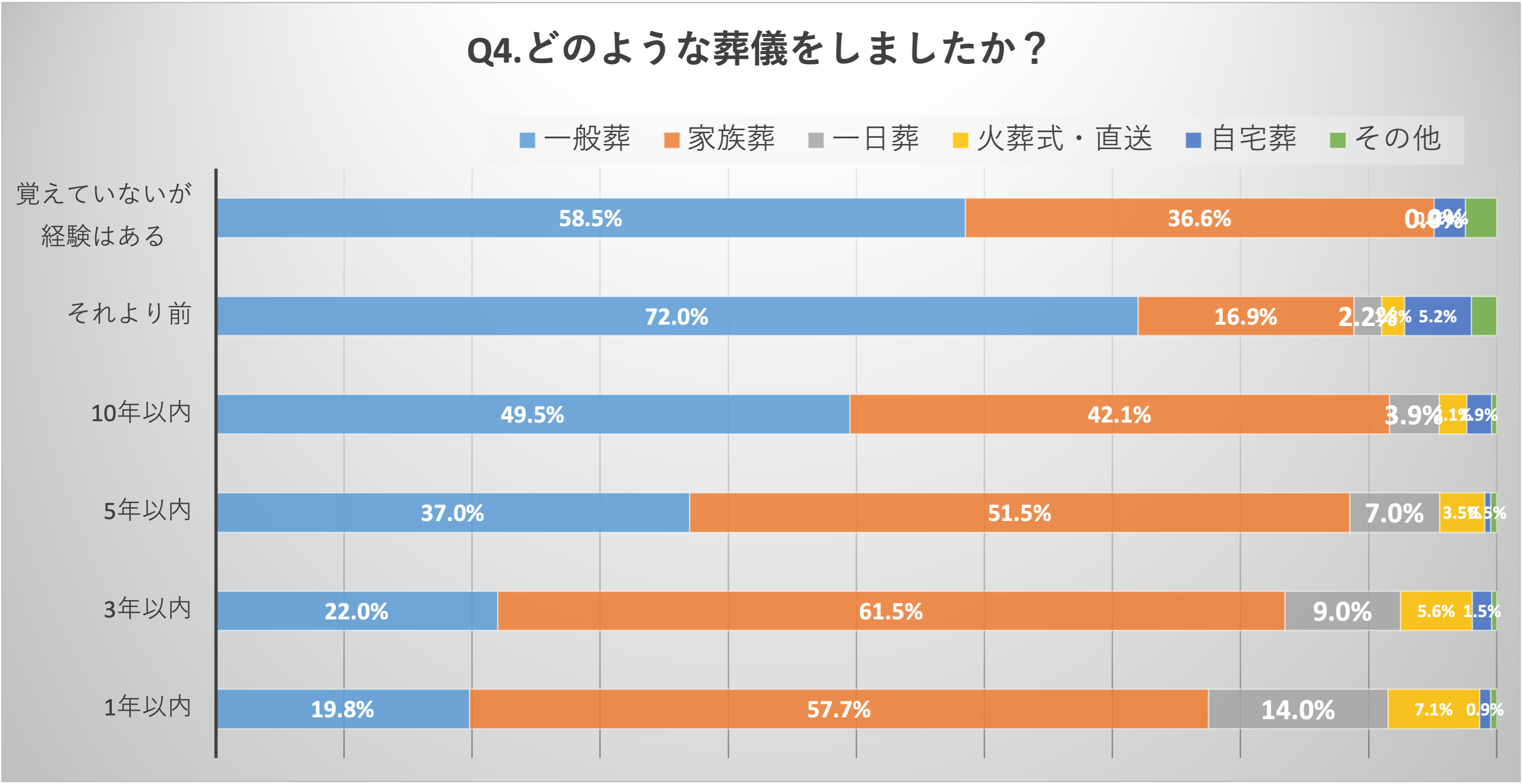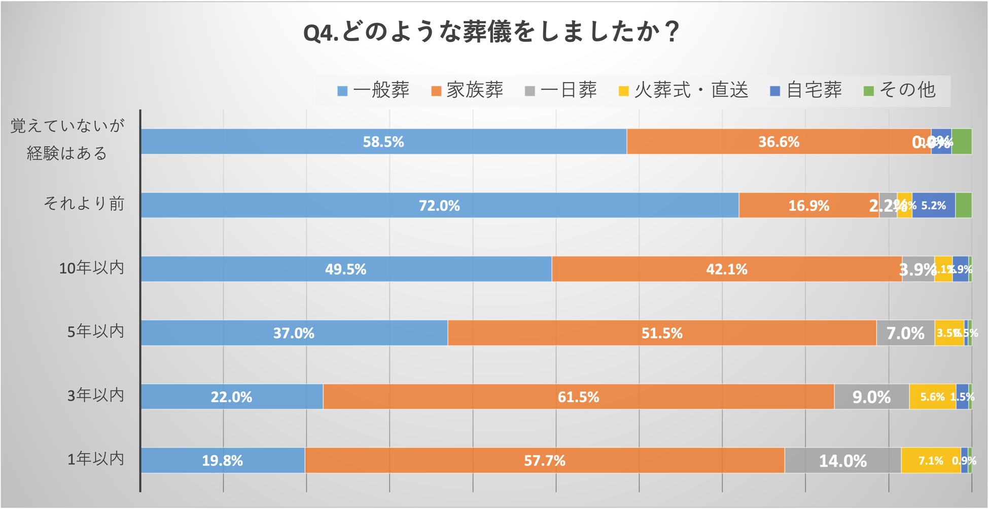 一番直近の葬儀について、10年前までは主流だった一般葬が5年以内で逆転、