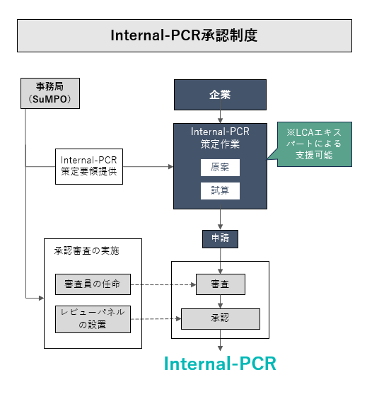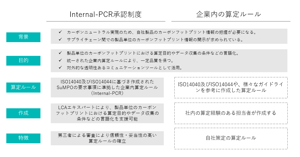 一方で、そのための共通基盤が未整備のため、信頼あるカーボンフットプリントの算定ルールの策定が求められています。そこで、ISO国際規格(ISO14025;タイプⅢ環境ラベル)に基づくEPDプログラムで実績のあるSuMPOでは、当該プログラムで用いるPCR(プログラムPCR)のノウハウを基に、企業内算定ルールを定めるための「Internal‐PCR策定要領」を開発しました。