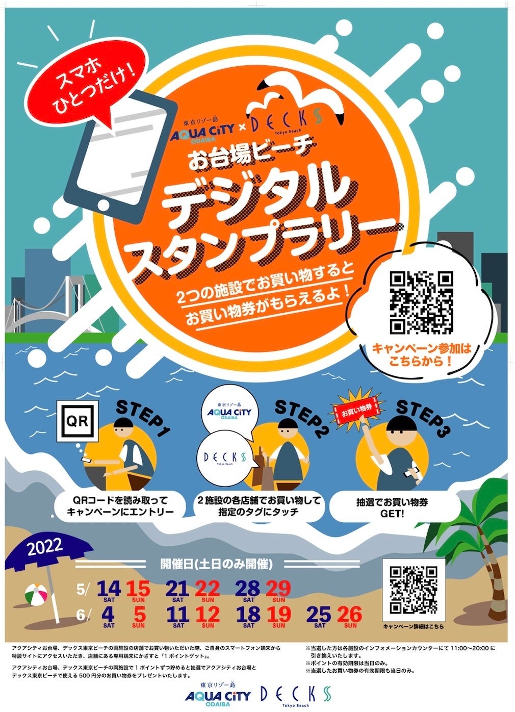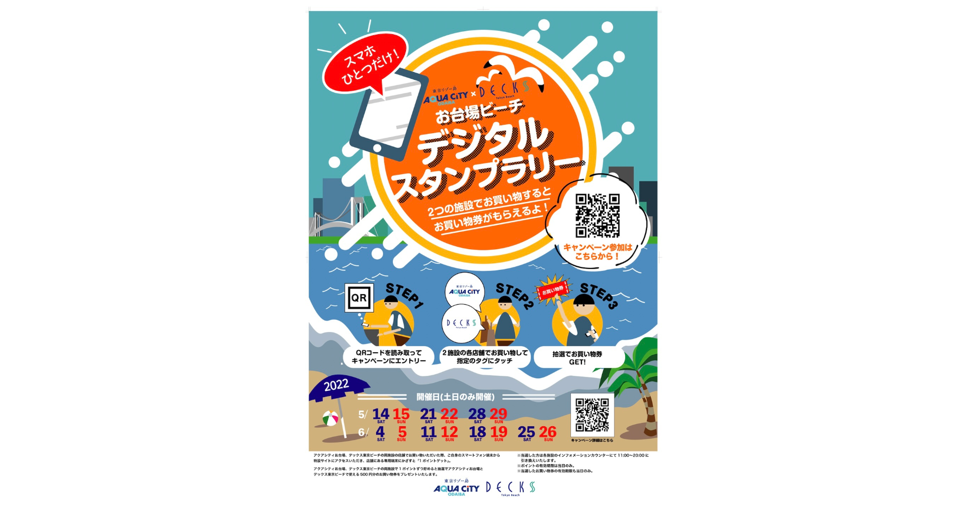 この度開催する「お台場ビーチデジタルスタンプラリー」は、「アクアシティお台場」と「デックス東京ビーチ」の2館を横断して実施いたします。お客様は各館から1つずつ店舗を選んでお買い物をするとスタンプを獲得。スタンプを集めたお客様に、2館共通で利用可能なお買物券(500円分)をプレゼントいたします。