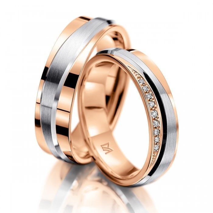 プラチナとゴールド、グロスと艶消し。マテリアルと表面仕上げのそれぞれにコンビネーションを取り入れたデザイン。2色のマテリアルに対し、クロスするようセッティングされたダイヤモンドが、絶妙なデザインバランスを生み出しています。