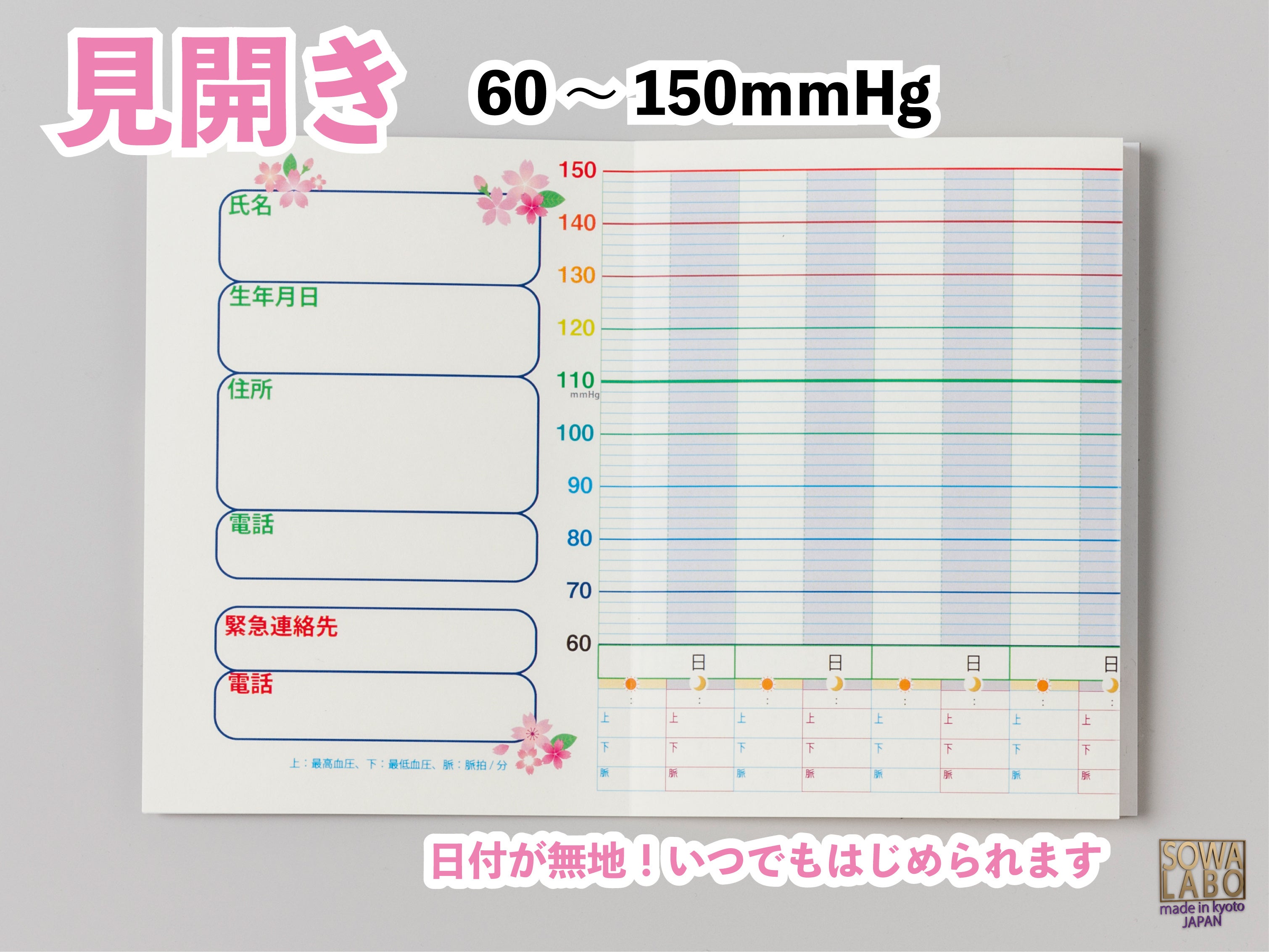 特徴:ロングでワイドなパノラマ折れ線グラフ、ポケットに入る薄さと軽さ、日付が無地なので何時からでも血圧記録が始められます。