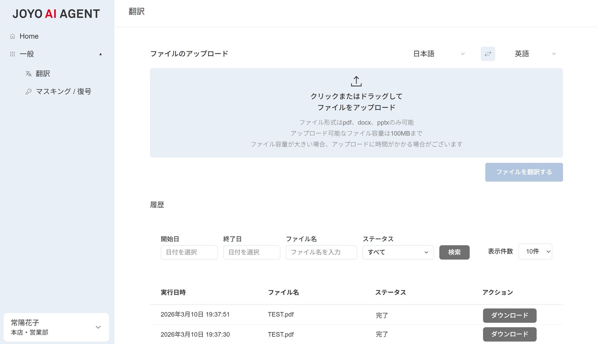 また、操作性にも配慮して、ファイルをアップロードし、ボタンをクリックするだけで処理が実行される「プロンプトレス(指示文不要)」のユーザーインターフェースを採用しました。これにより、AIに関する専門的な知識がない行員でも円滑に利用することができます。