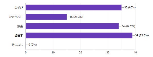 また歯並びが気になるママ・パパも多く、現在の乳歯の生え方や、指しゃぶりなどの癖が将来の歯並びに影響するのではと心配する声がみられました。