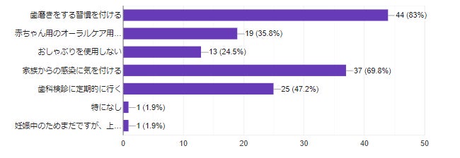 離乳食の硬さに気を付けているママ・パパが最も多く、柔らかいものばかりではなく成長に合わせて食べ物の硬さを変え、噛む練習ができるようにしているとのこと。また口呼吸がかみ合わせや虫歯に影響すると理解しているママ・パパも多く、子どもの口が開いていたら閉じるように声をかけるなど鼻呼吸を心がけているようです。
