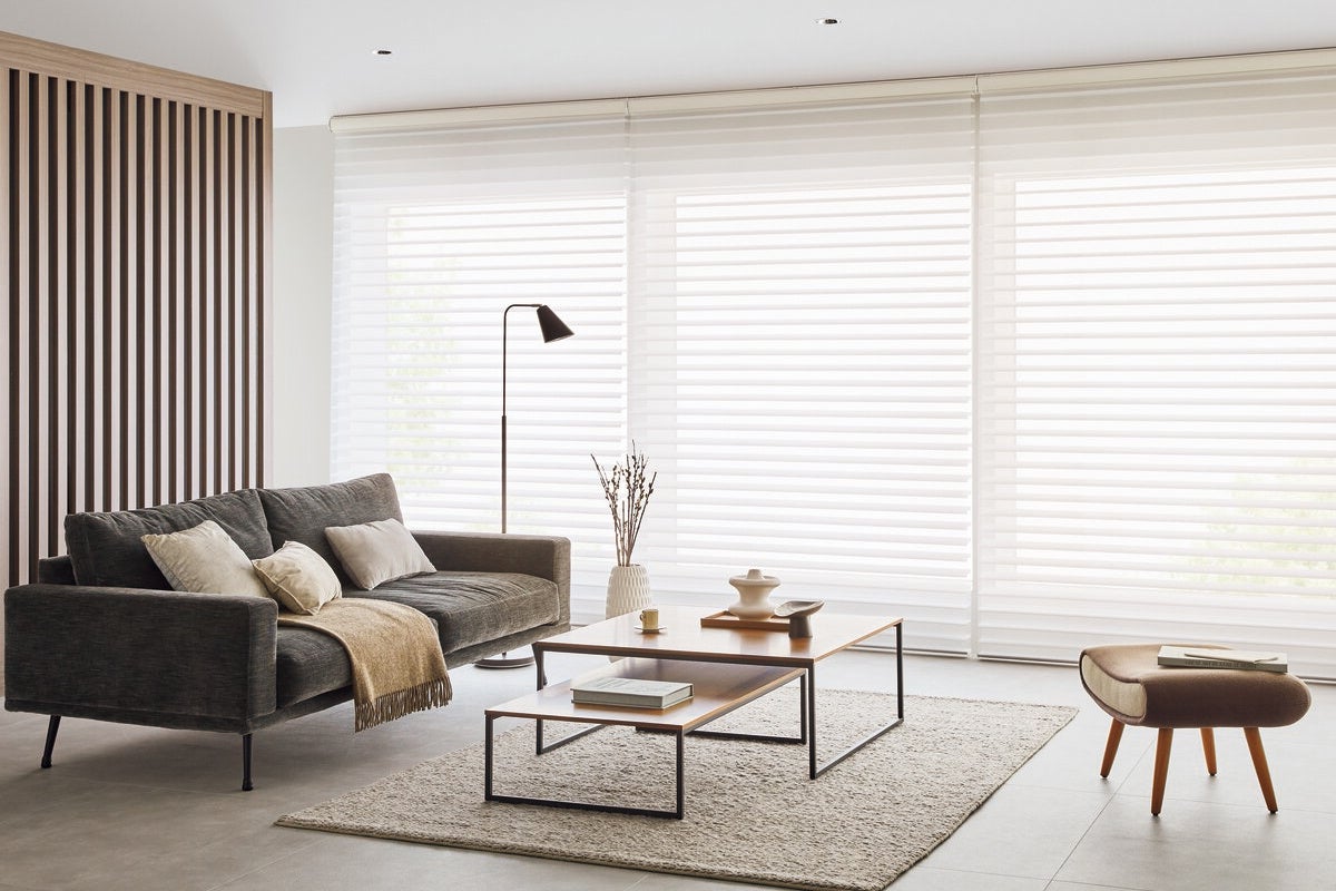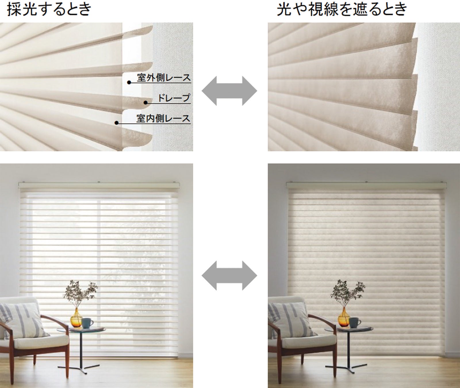 ブラインドのようにドレープを回転させて採光を調節します。全閉状態からチェーンやリモコンでドレープを開けると、室内に入る採光量をコントロールできます。