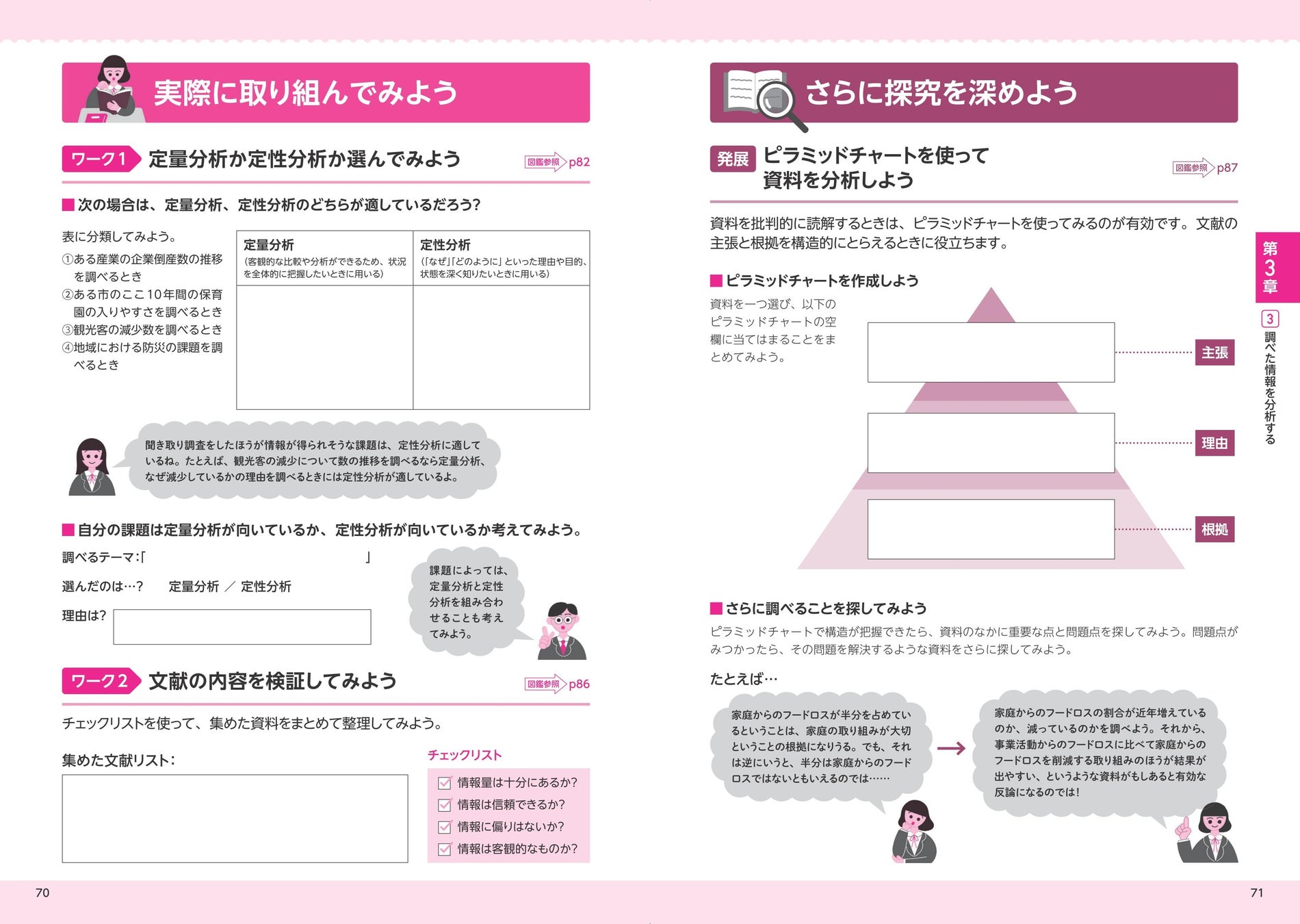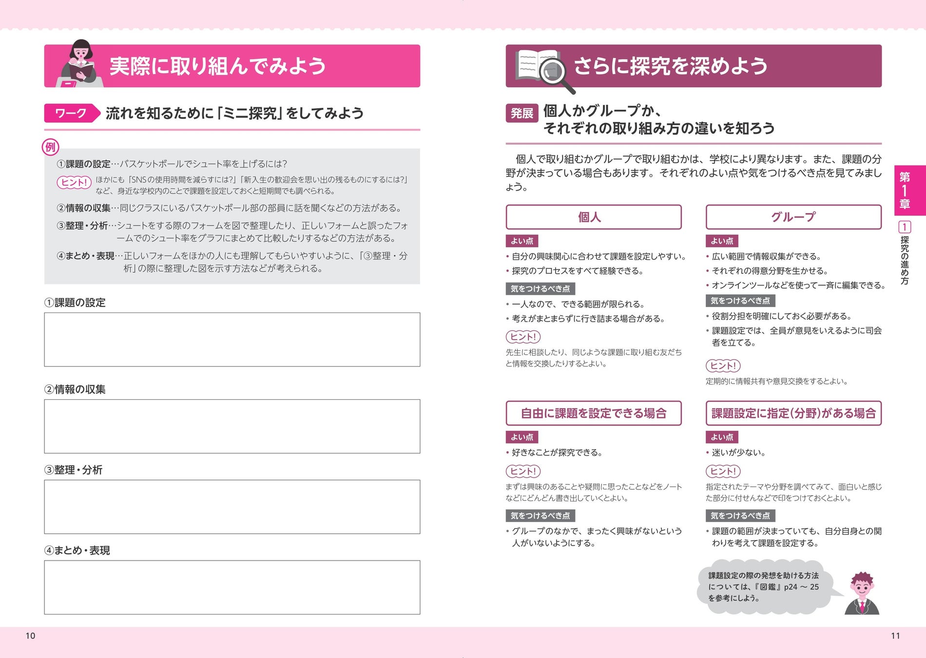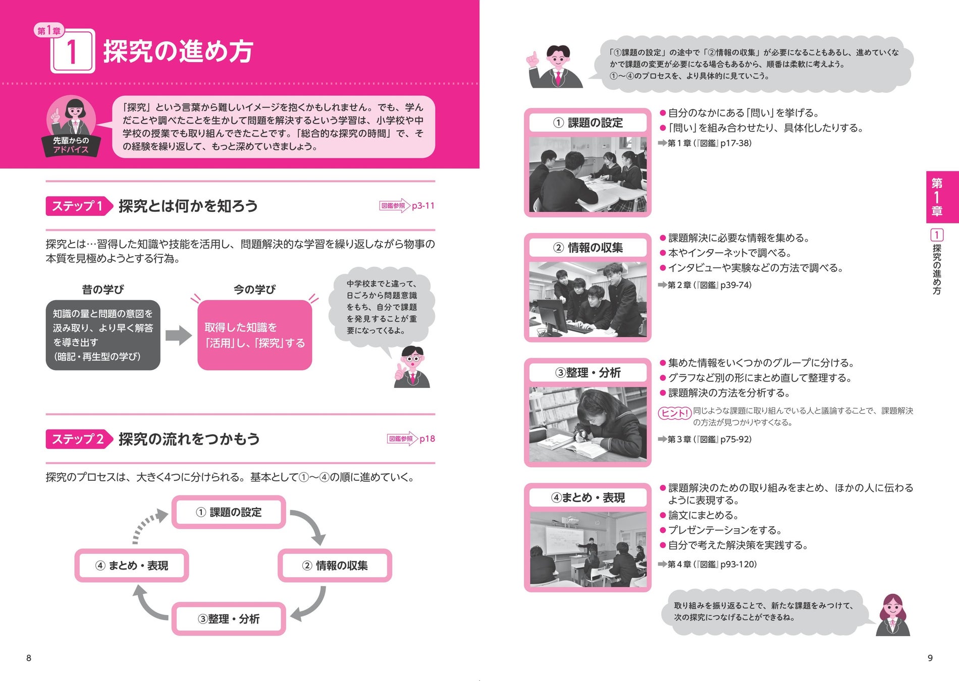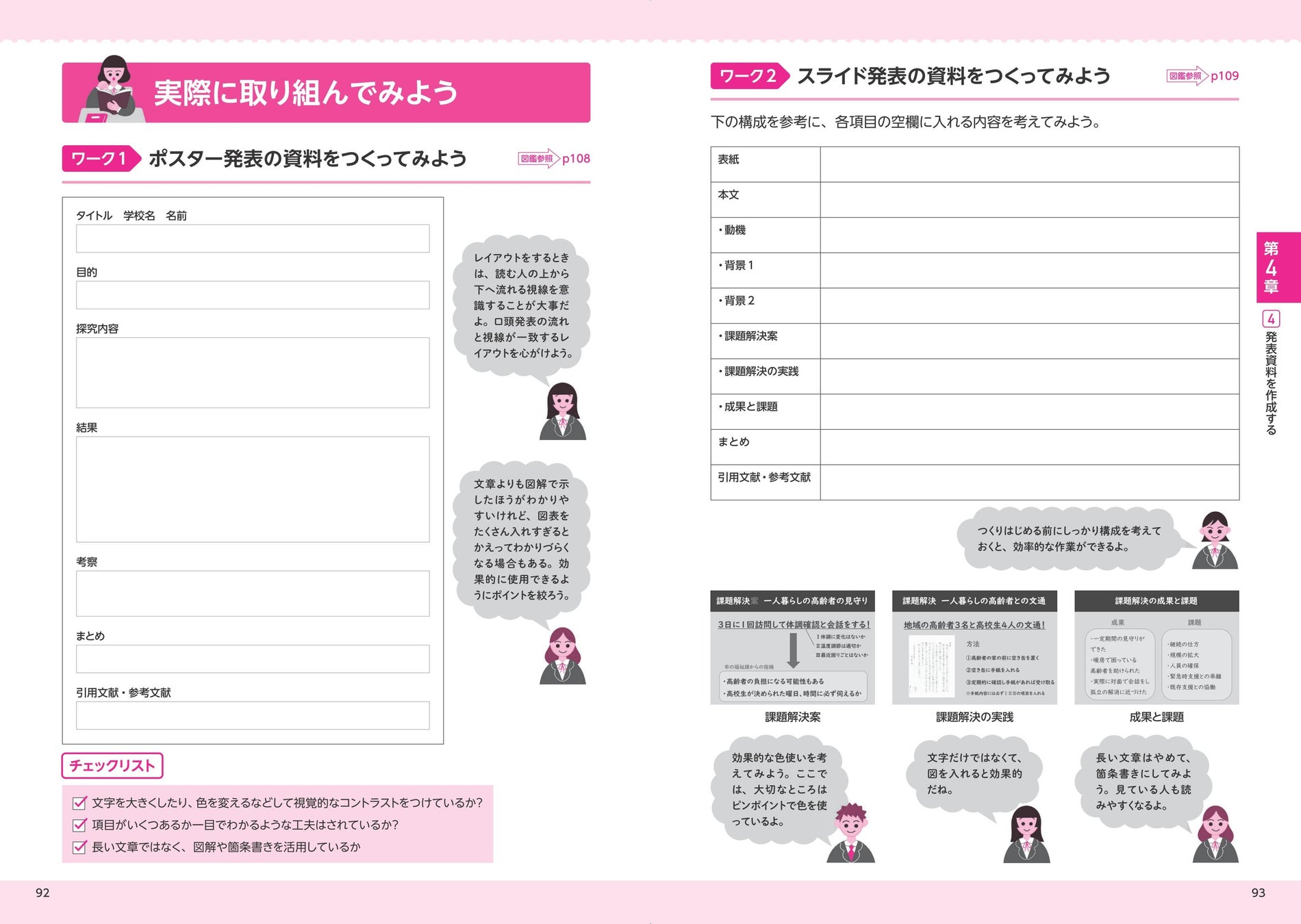 4章では課題解決策の見つけ方にはじまり、学習の振り返りや記録をレポートや論文にする方法、さらに発表資料の作成の仕方や発表のコツを学びつつ、次の探究課題の設定に向けての準備ができるようになっています。