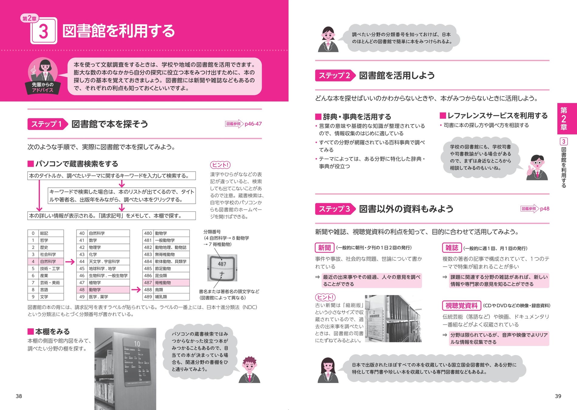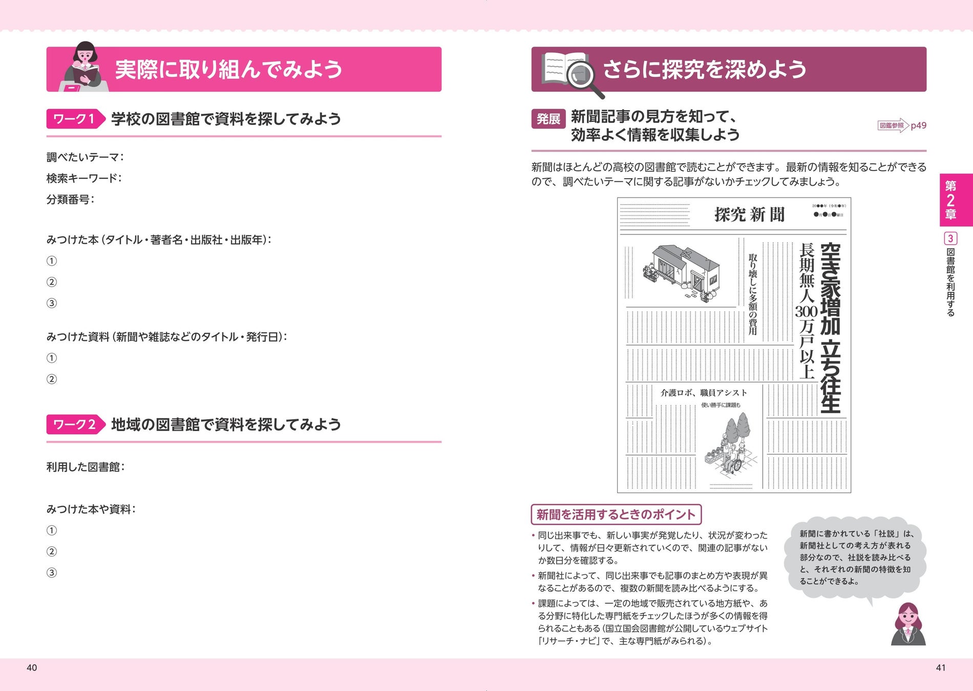 1章を通じて出てきた課題は、当たり前ですが生徒によってさまざま。加えて、その情報の集め方や調べ方も各々変わってきます。そこで2章では課題に合った情報収集の方法と具体的な活用の仕方を学びます。