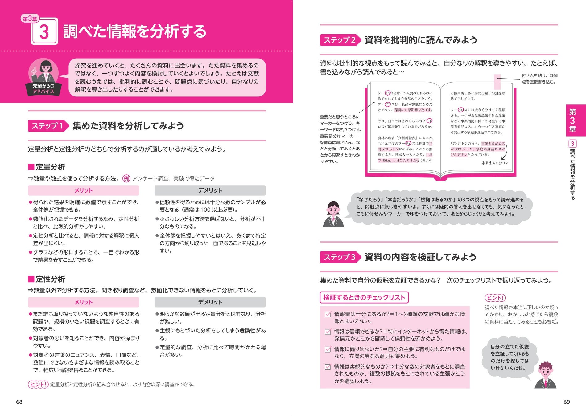 1章で課題を見つけ、2章でそれにまつわる有益な情報は集めました。しかし、ただ情報を収集しただけでは不十分で、うまく活用しているとはいえません。そこで3章では得られた情報を整理し、データ化して、一人ではなくディスカッションすることでより分析を深めていく方法を学んでいきます。