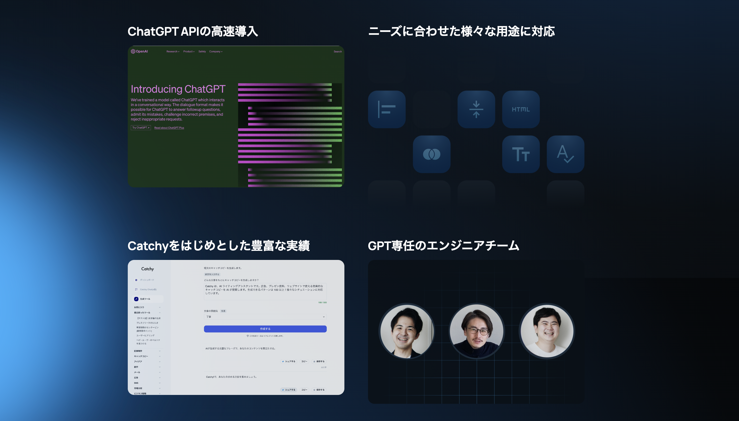 AI works for ChatGPTは、GPTシリーズを活用した国内最大級のAIコピーライティングツール「Catchy(キャッチー)」(会員数5万人)を運営する株式会社デジタルレシピ(以下「デジタルレシピ」)が、これまでのGPTシリーズ関連開発の知見を活かし、企業のChatGPT API導入を支援する開発&コンサルティングサービスです。