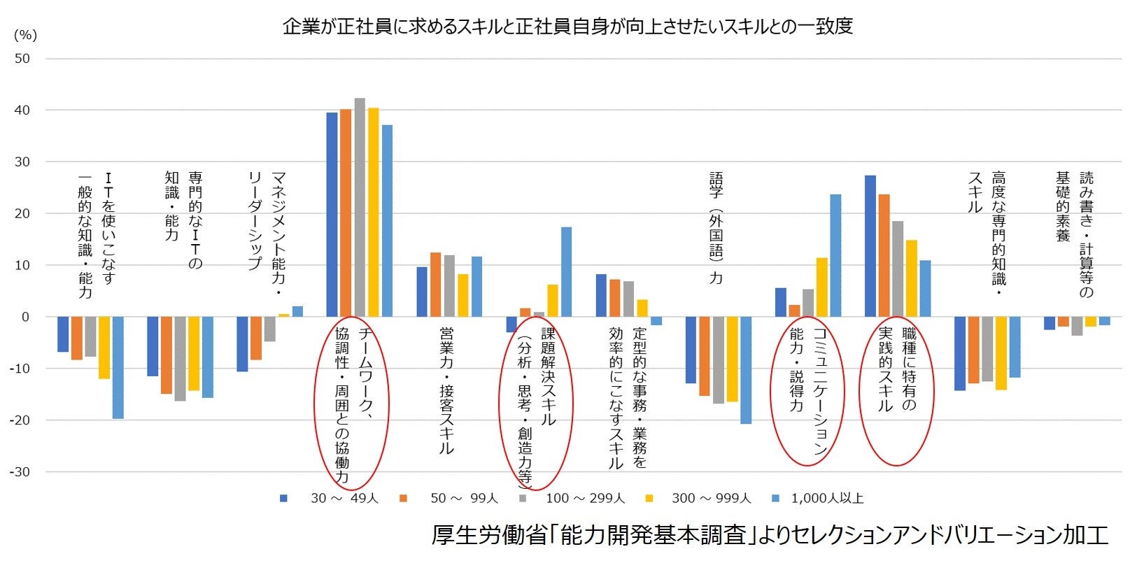 最後に、企業が正社員に求めるスキルと正社員自身が向上させたいスキルとの一致度についても、企業規模によって異なることが判明しました。正社員自身が持つ向上意欲以上に企業が強く求めるスキルとして、常用労働者数が多くなるほど、「課題解決スキル」や「コミュニケーション能力・説得力」を、常用労働者数が少なくなるほど、「職種に特有の実践的スキル」を挙げていることが分かりました。