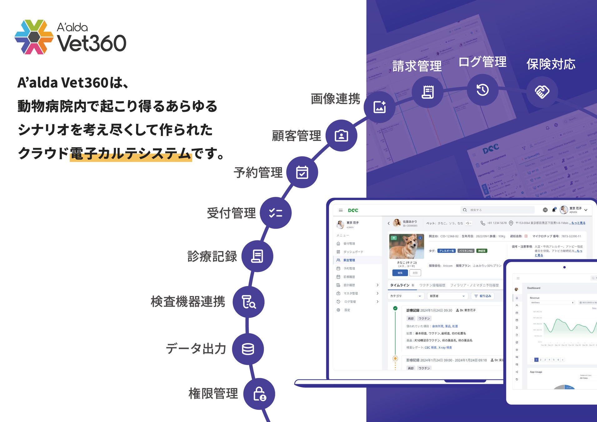 Vet360は、動物病院の予約から会計まで、すべての業務を一元管理できるクラウド型電子カルテです。急成長を遂げるA'aldaグループが、40以上の自社病院との協働で得られた知見を基に、業界最大規模の開発チームと共に作り上げました。直感的で使いやすいデザインと最新技術を駆使し、獣医療を支える皆様の力を最大限に引き出すためのツールです。