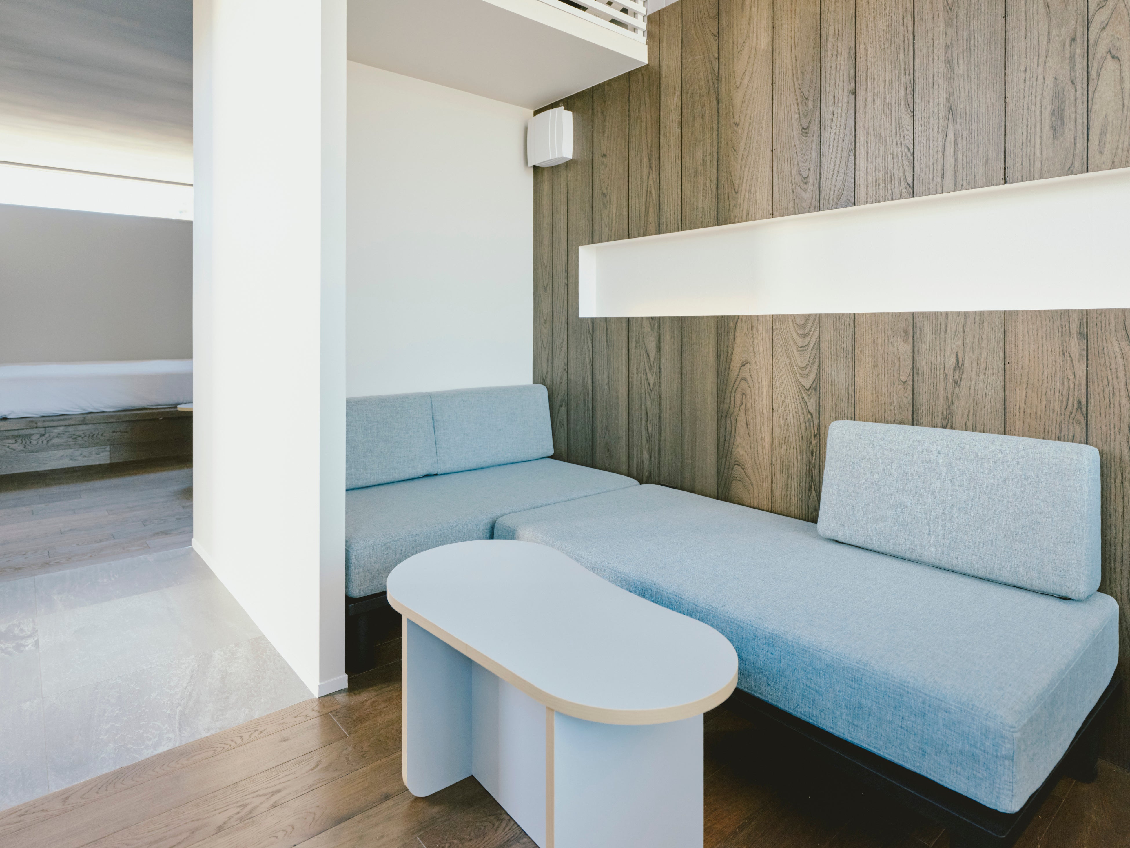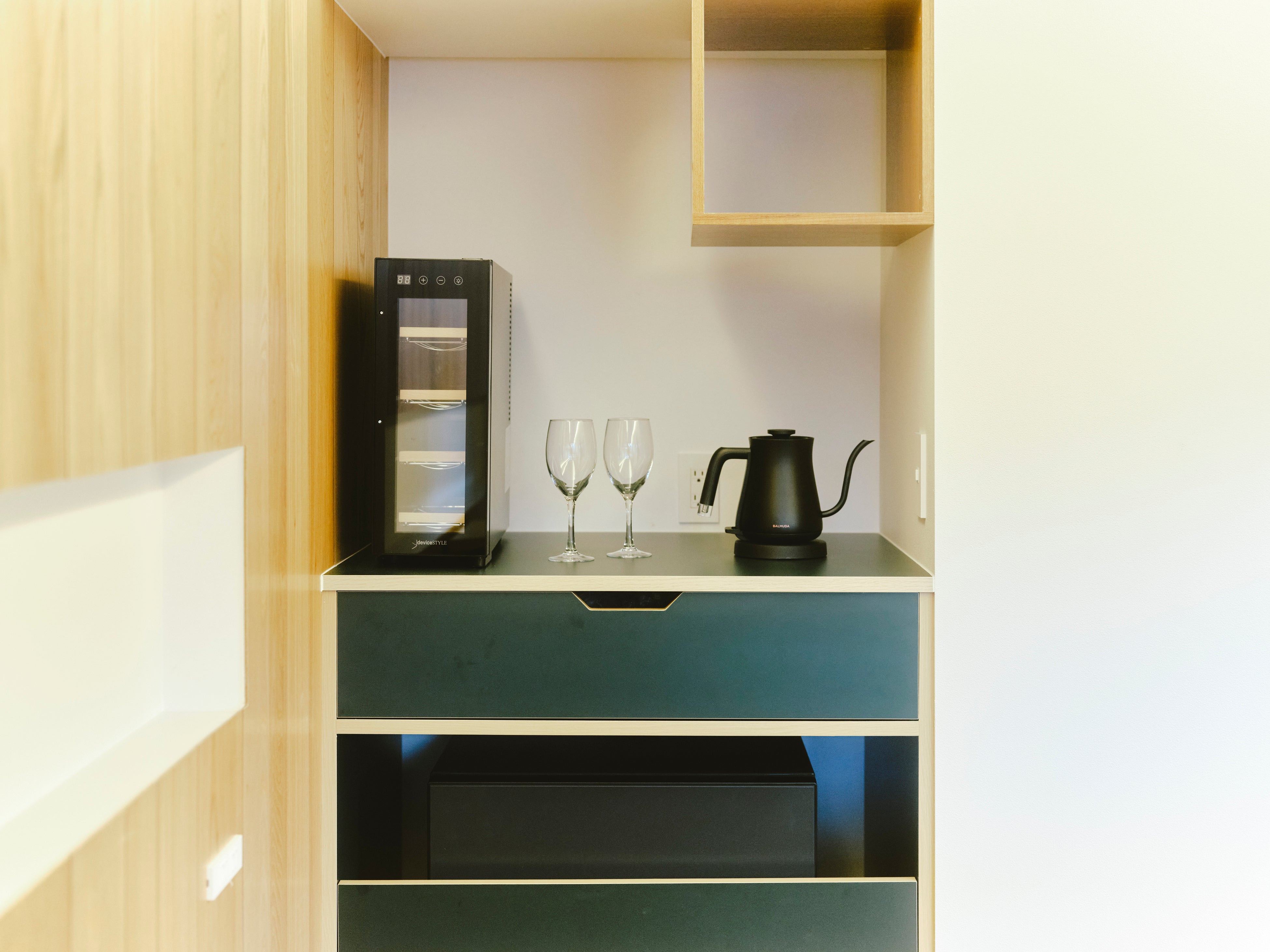棟内設備:露天風呂、シャワー、ベッド(NELL製)、トイレ、リビングスペース、デッキスペース、エアコン、冷蔵庫、ワインセラー(一部客室)