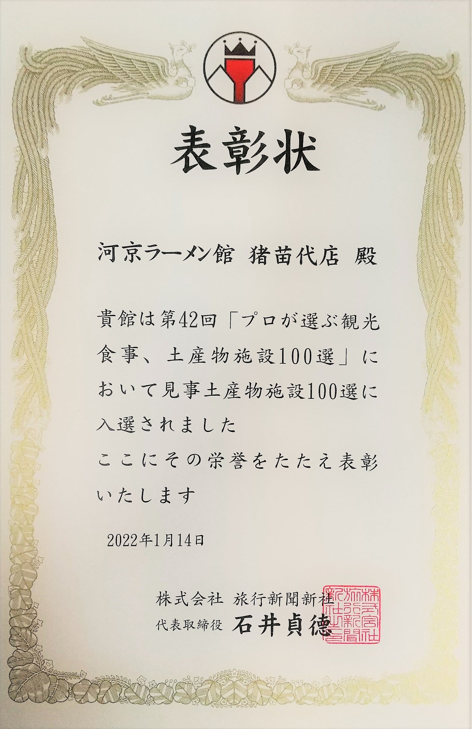 株式会社河京 ラーメン館猪苗代店(本社:福島県喜多方市、代表取締役:佐藤富次郎)は、~第42回プロが選ぶ土産物施設100選に入選しました。