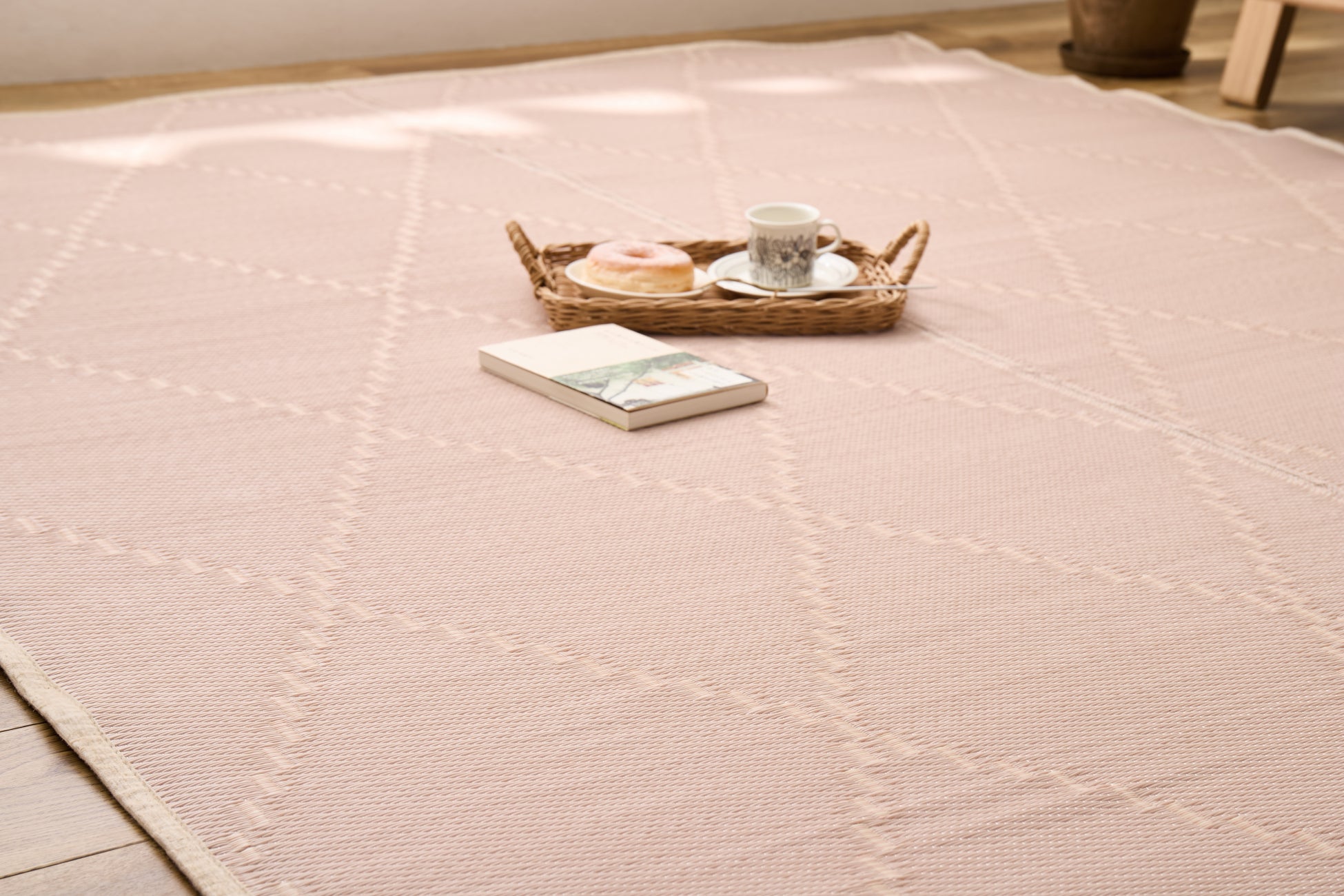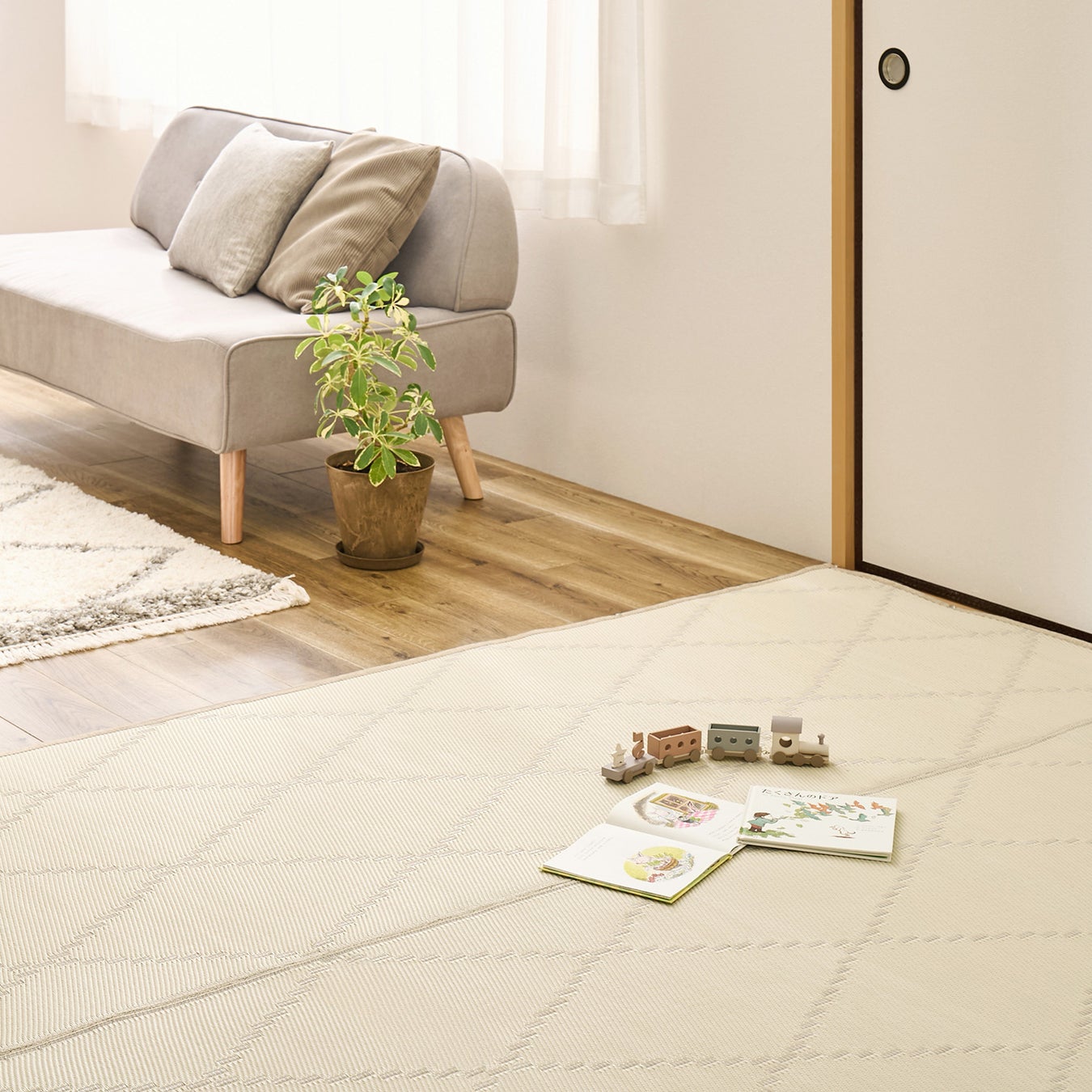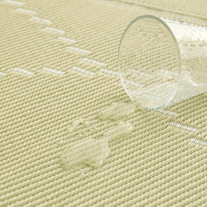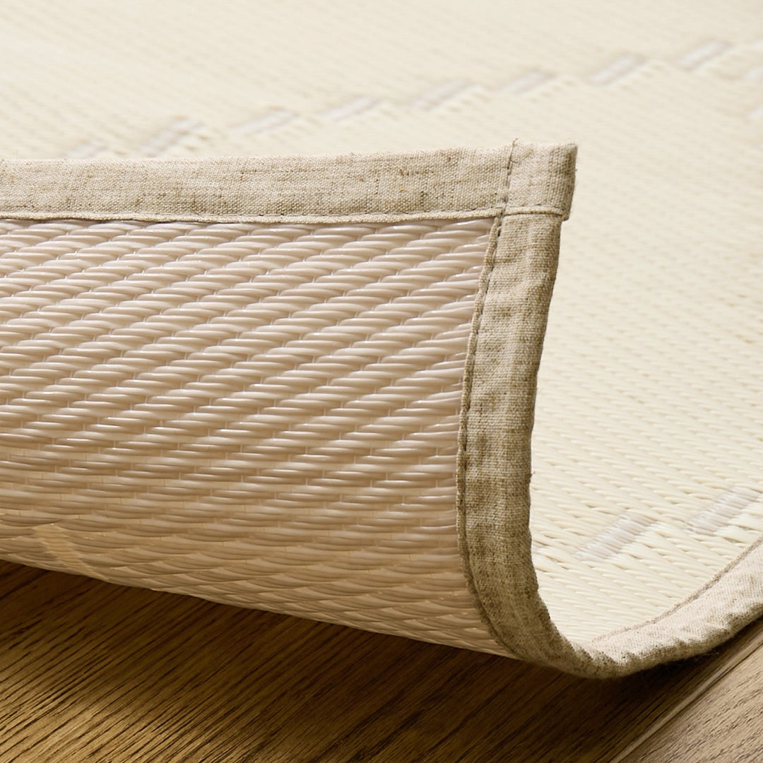 天然のい草と比べ、丈夫で摩耗やひっかきに強いポリプロピレン素材。小さな子どもやペットのいる方や、ダイニングラグとしてもおすすめの1枚です。